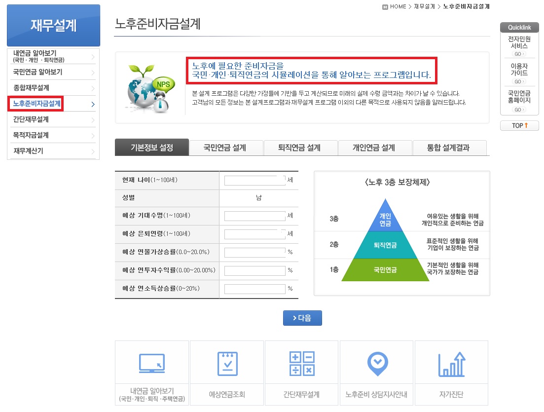 예상 연소득상승률을 입력하면 국민연금/퇴직연근/개인연금 설계가 나오고 이 설계를 다 마치면