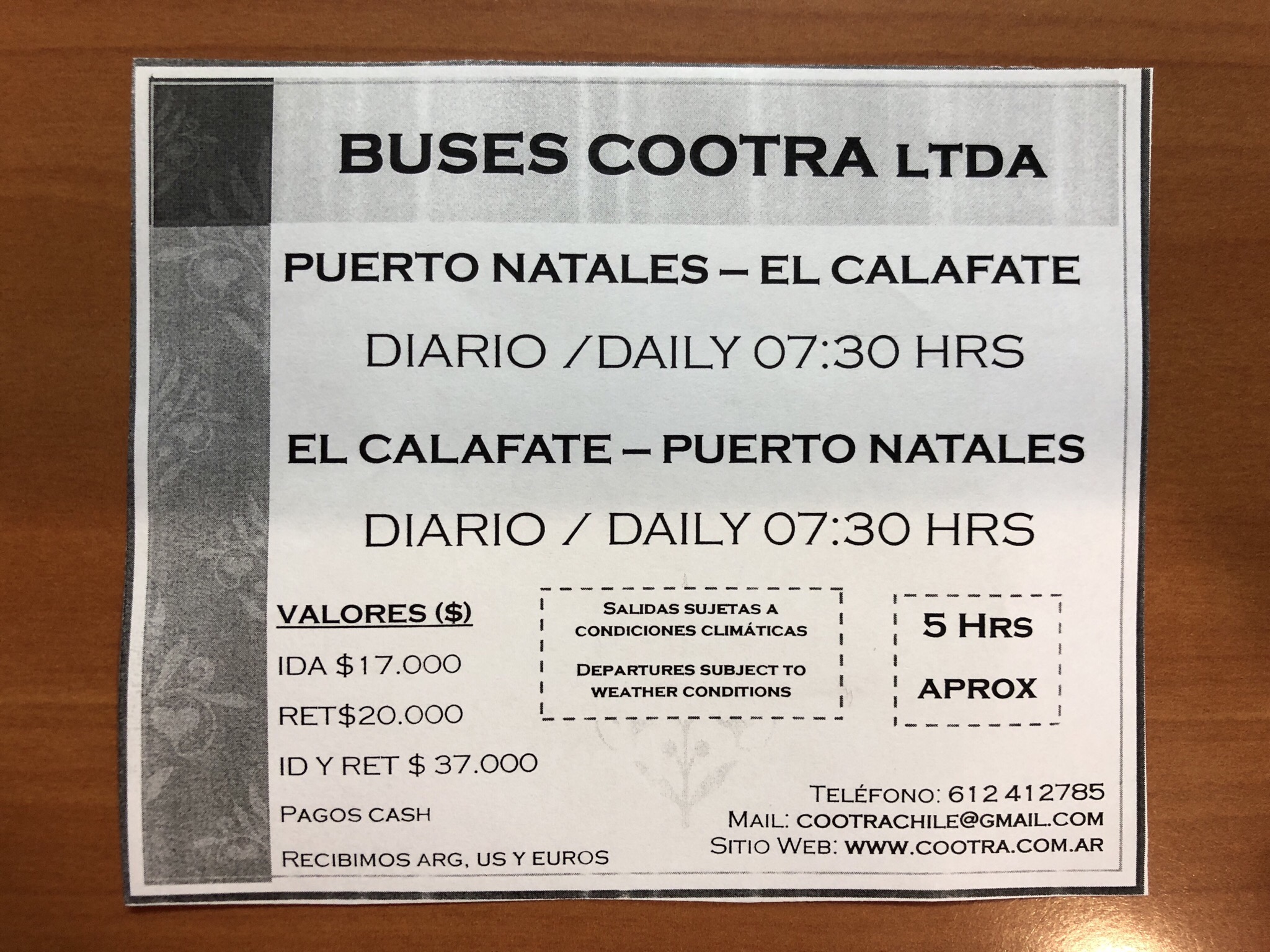 COOTRA LTDA. 라는 버스회사인데, 푸에르토-나탈레스와 엘 칼라파테를 매일 오간다.