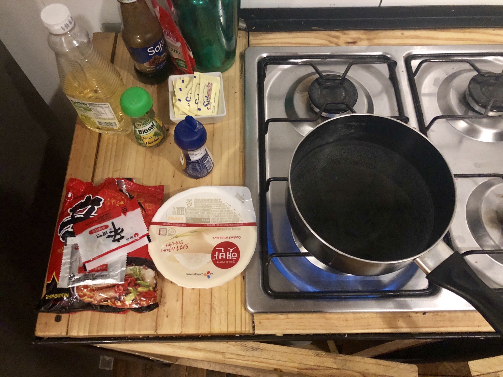 숙소에 돌아와서 비상식량을 꺼내 라면에 밥을 싹싹 다 말아서 비워냈다.