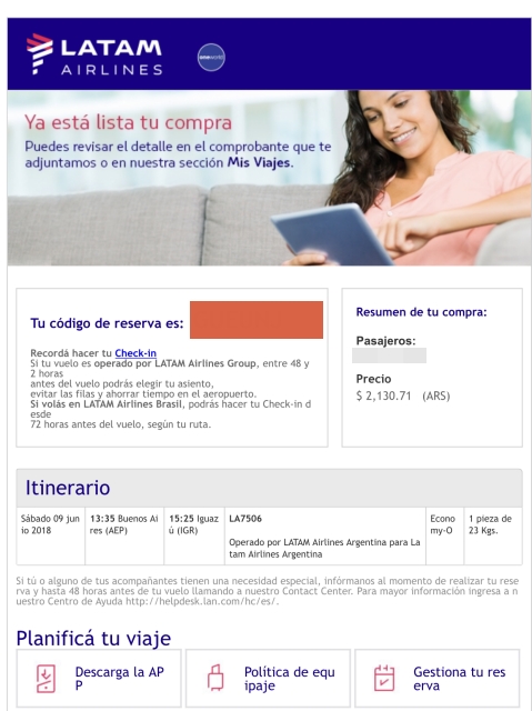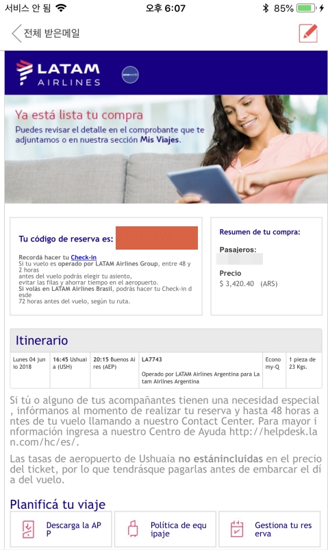 가는 항공권을 예매했다. 이 구간도 라탐항공이 운항하고 있었다.
