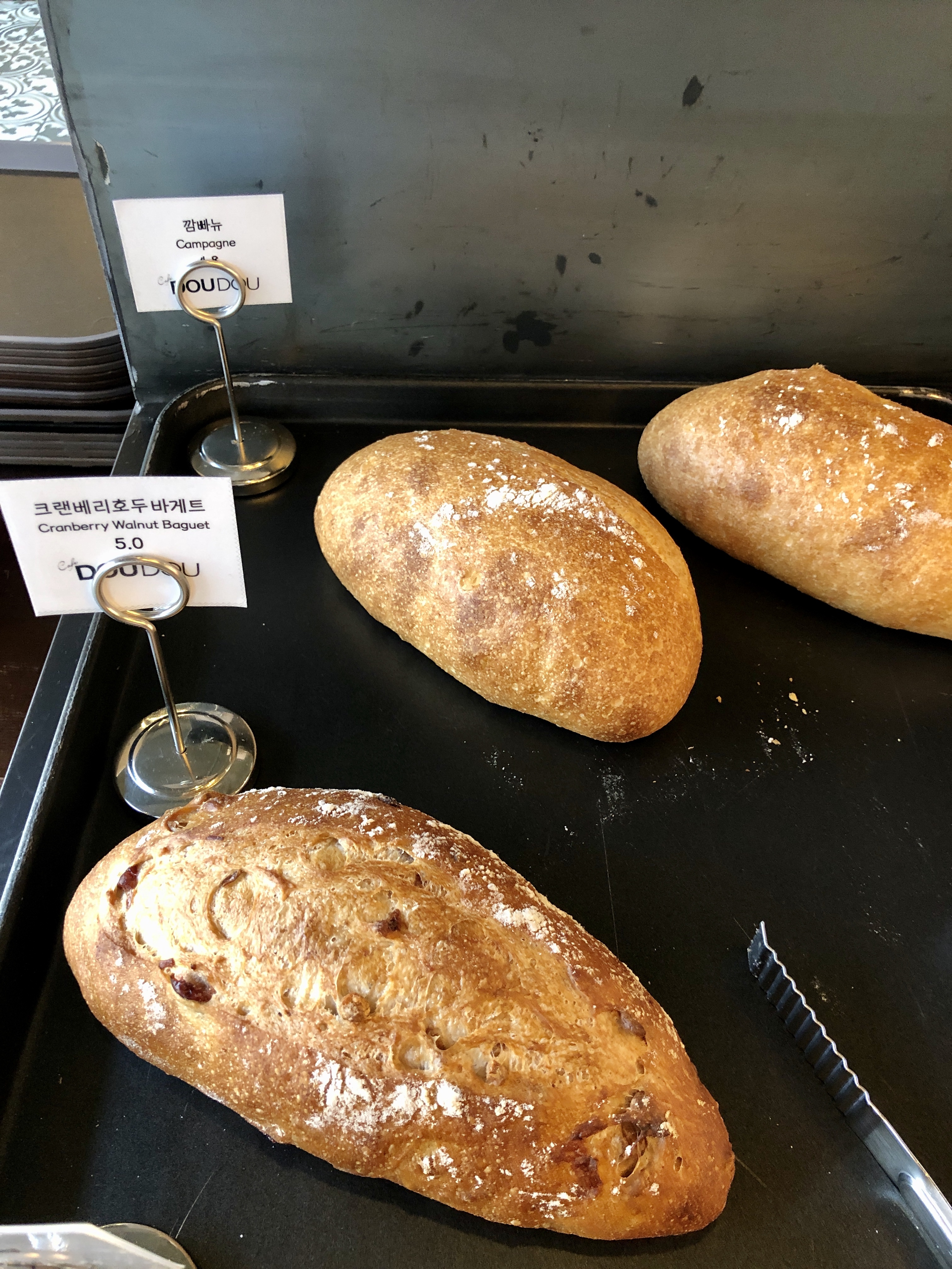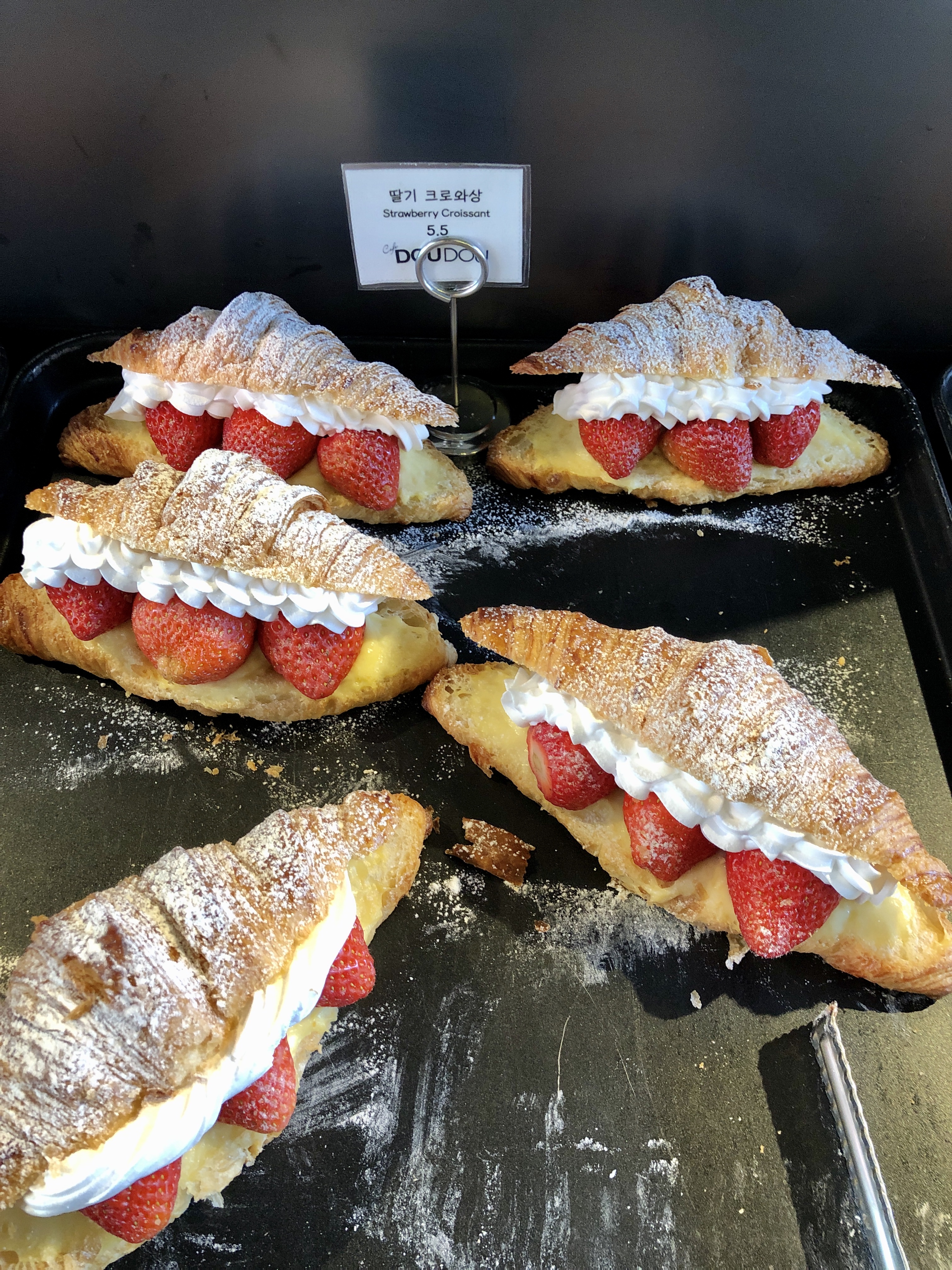 빵들이 다 맛있어 보였지만, 다 먹을수는 없어서 크랜베리 호두 바게트와, 딸기 크로와상 1개씩을 샀다.