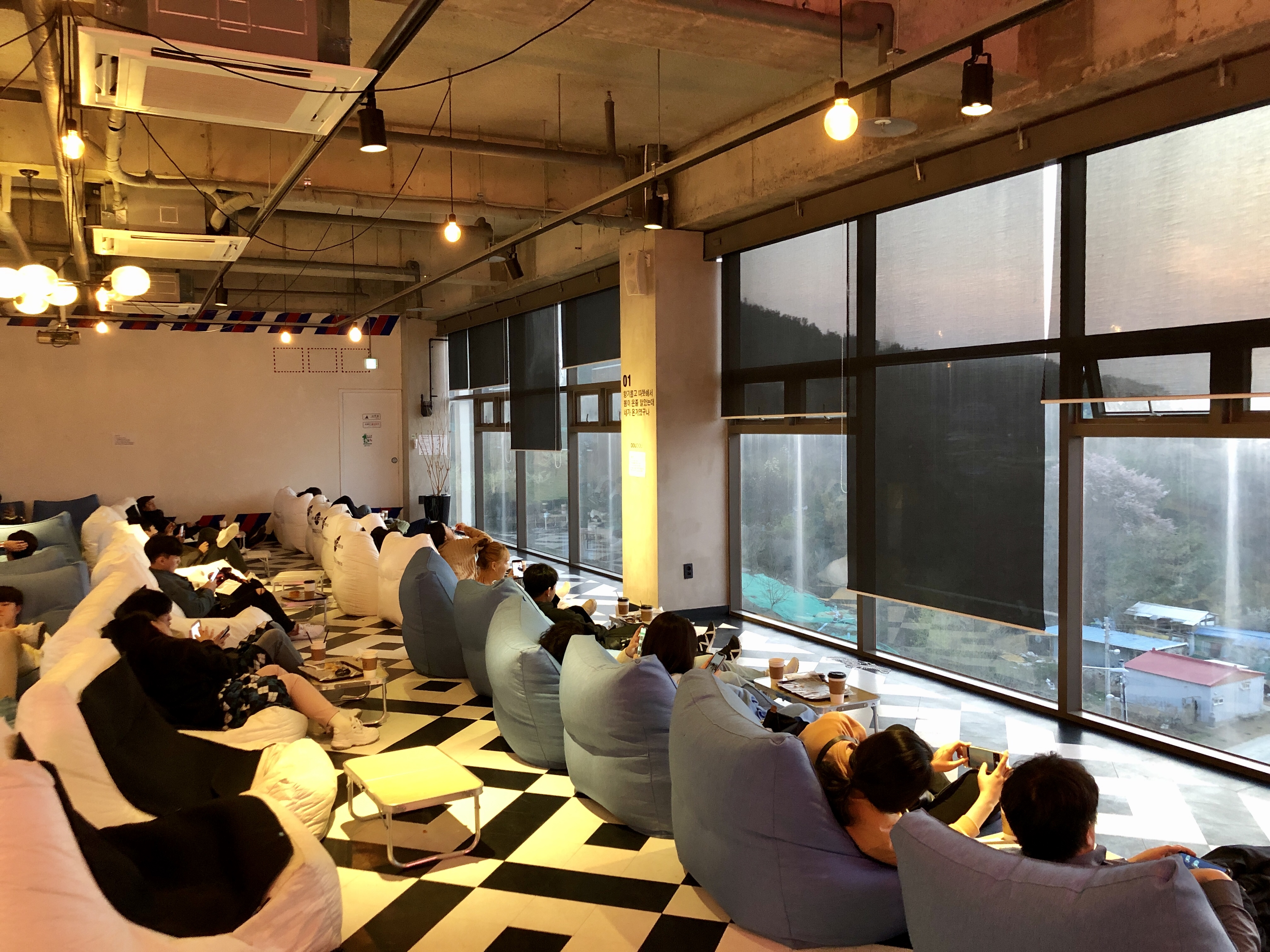 5층에 도착하면 바다쪽을 바라보며 앉을 수 있는 푹신한 쿠션 좌석이 놓여져있다.