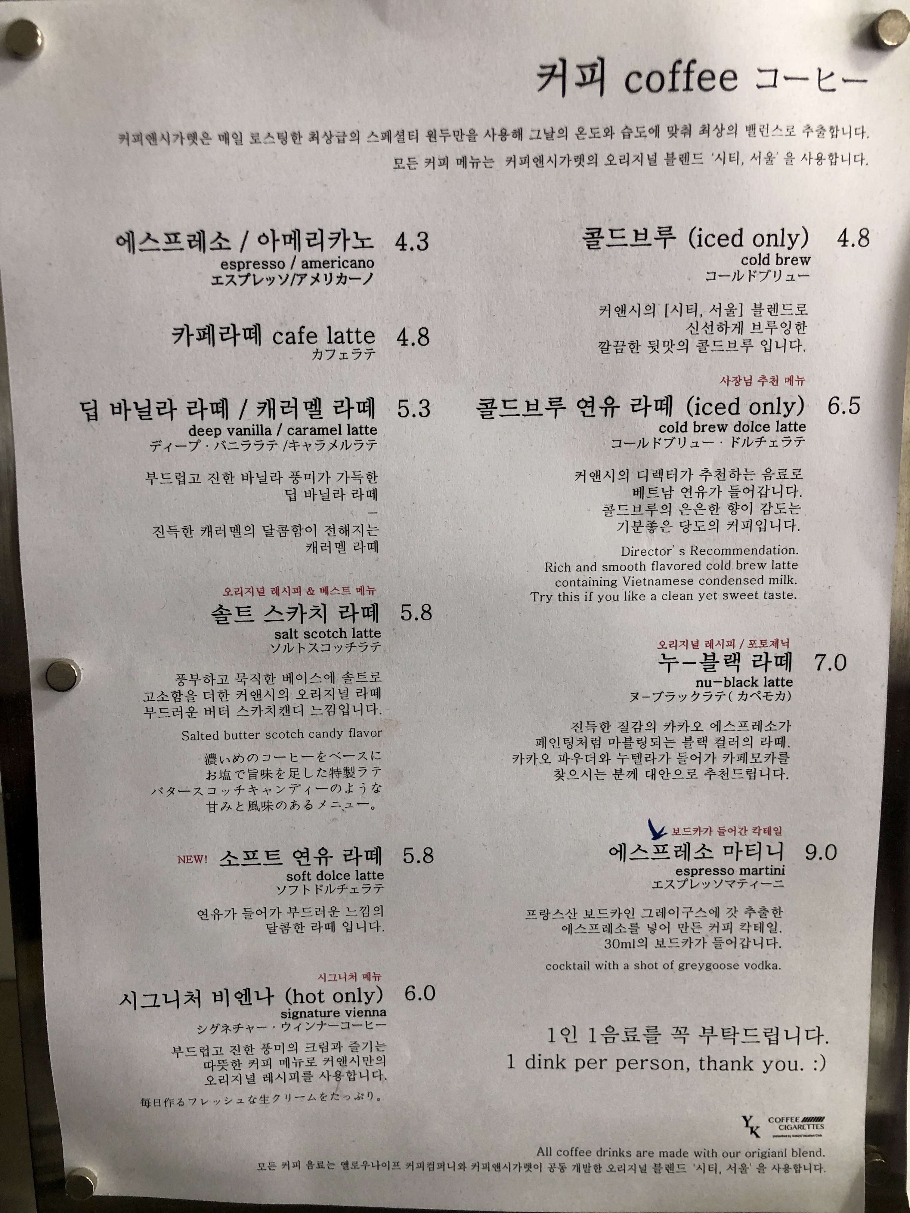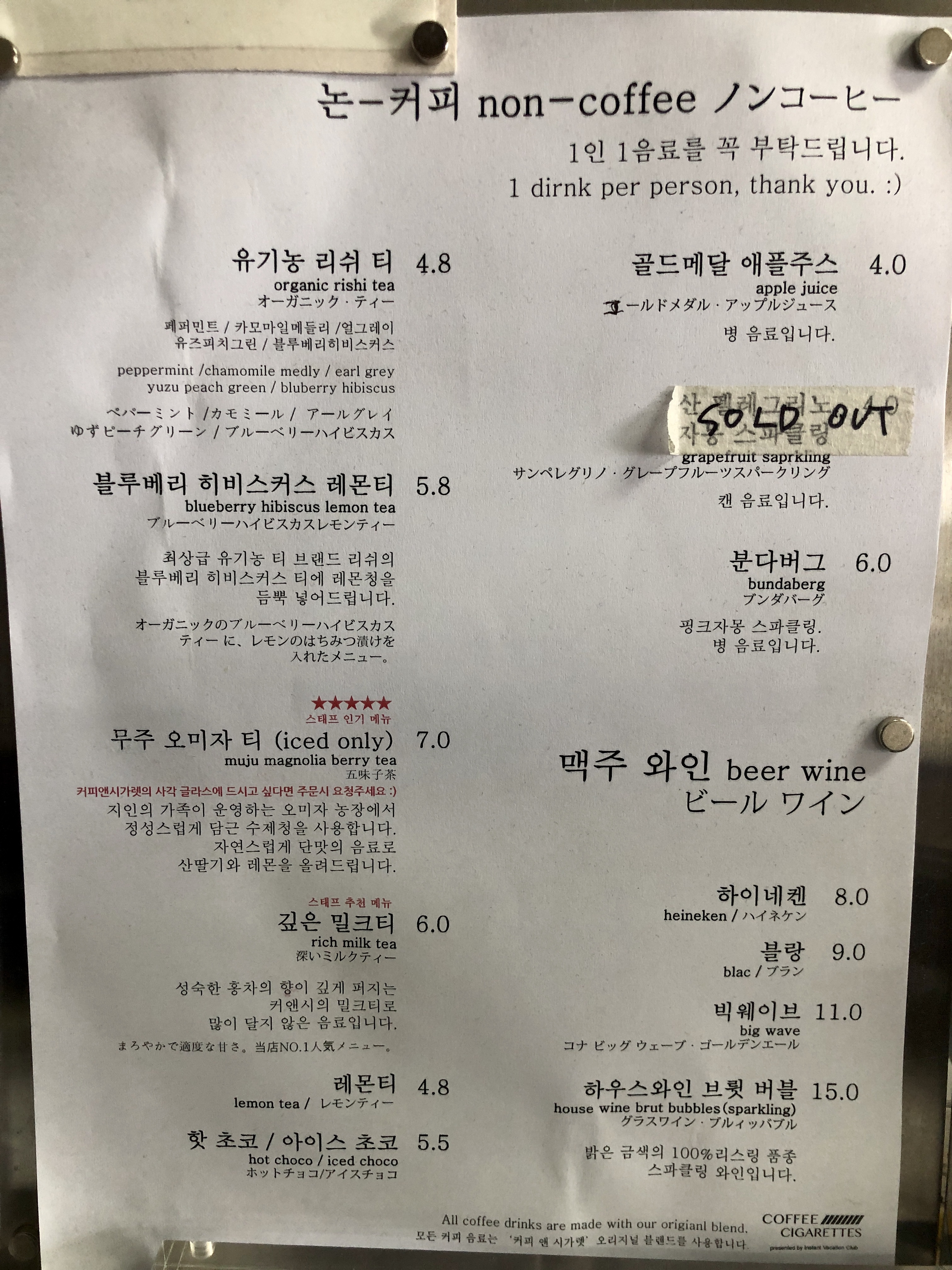 이곳에는 1인 1음료가 기본이며, 메뉴판은 커피와 논-커피로 나누어져 있다.