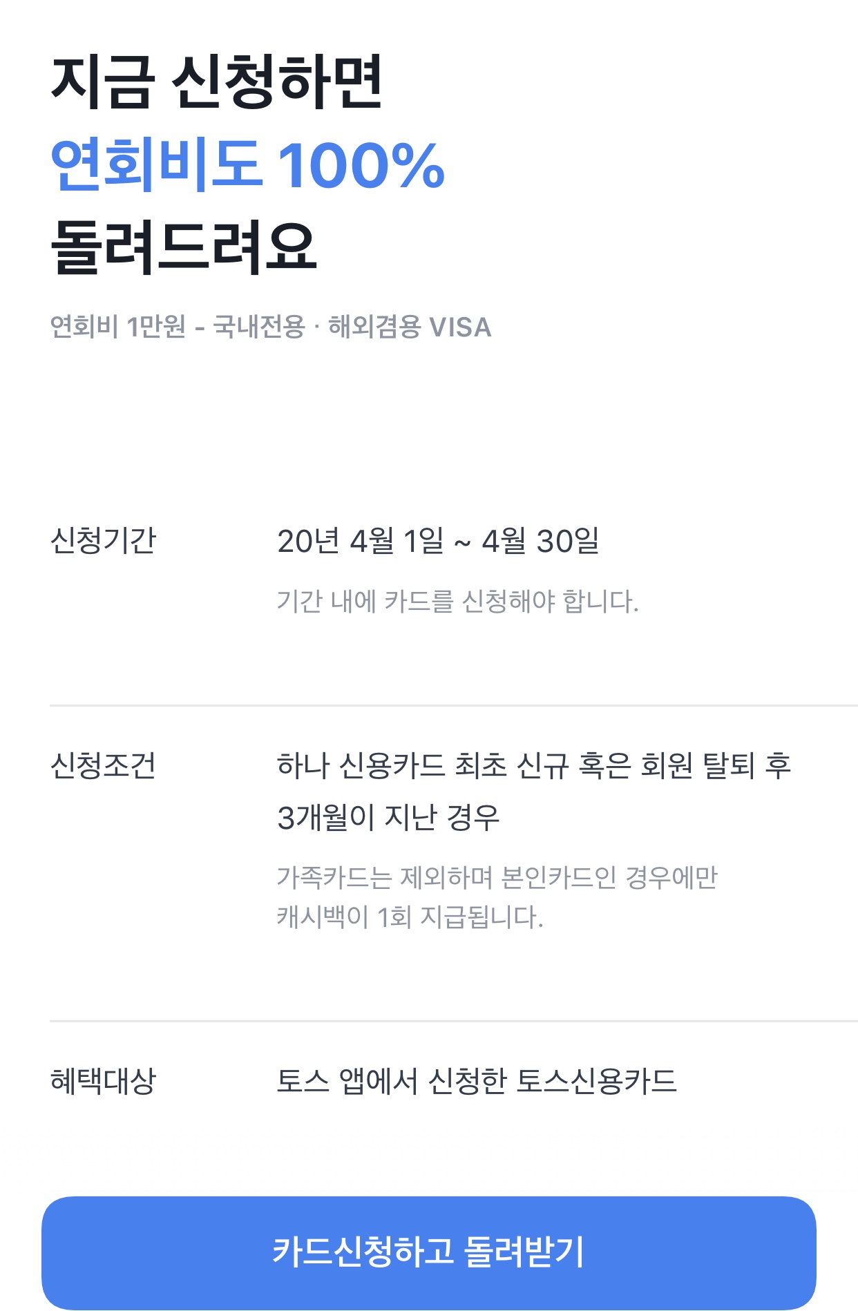 출시 기념으로 이번달 (2020년도 4월) 신청하면 연회비를 100% 돌려준다.