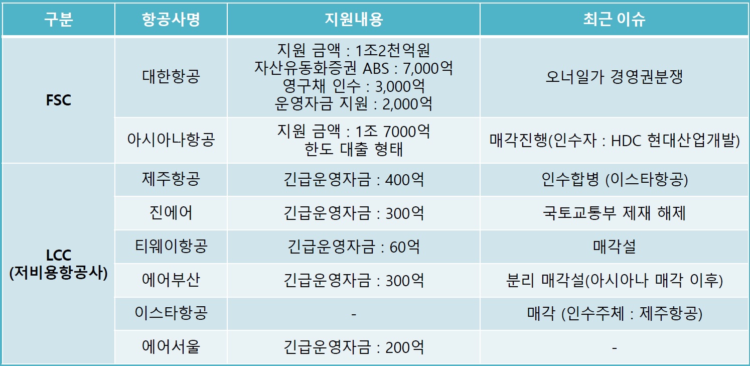 코로나19이후 국적항공사에 지원된 내용과 최근 이슈는 아래와 같다.