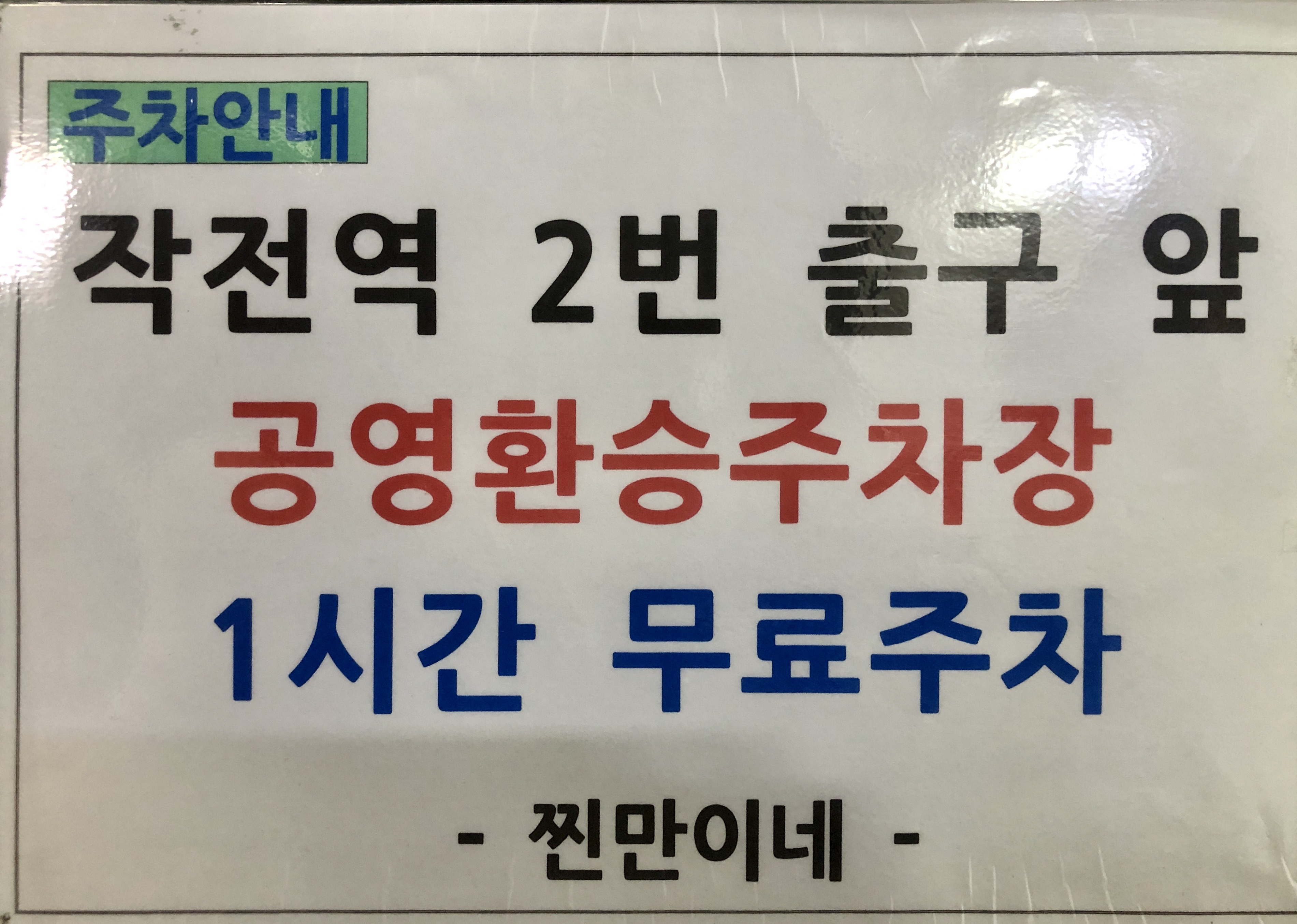 찐만이네에 온 손님은 작적역 2번 출구 앞 공영환승주차장에 주차할경우 1시간 무료주차가 가능하다.