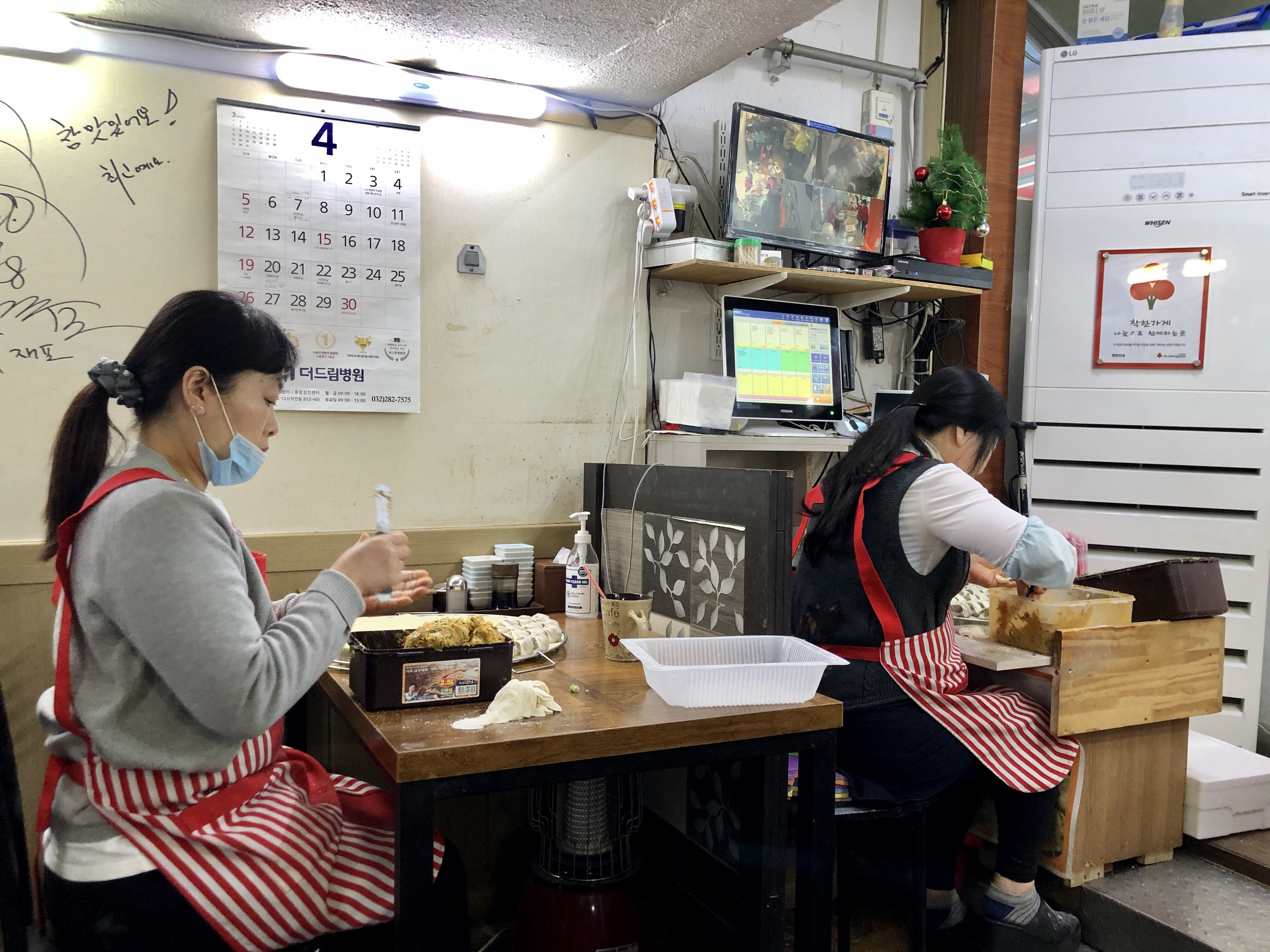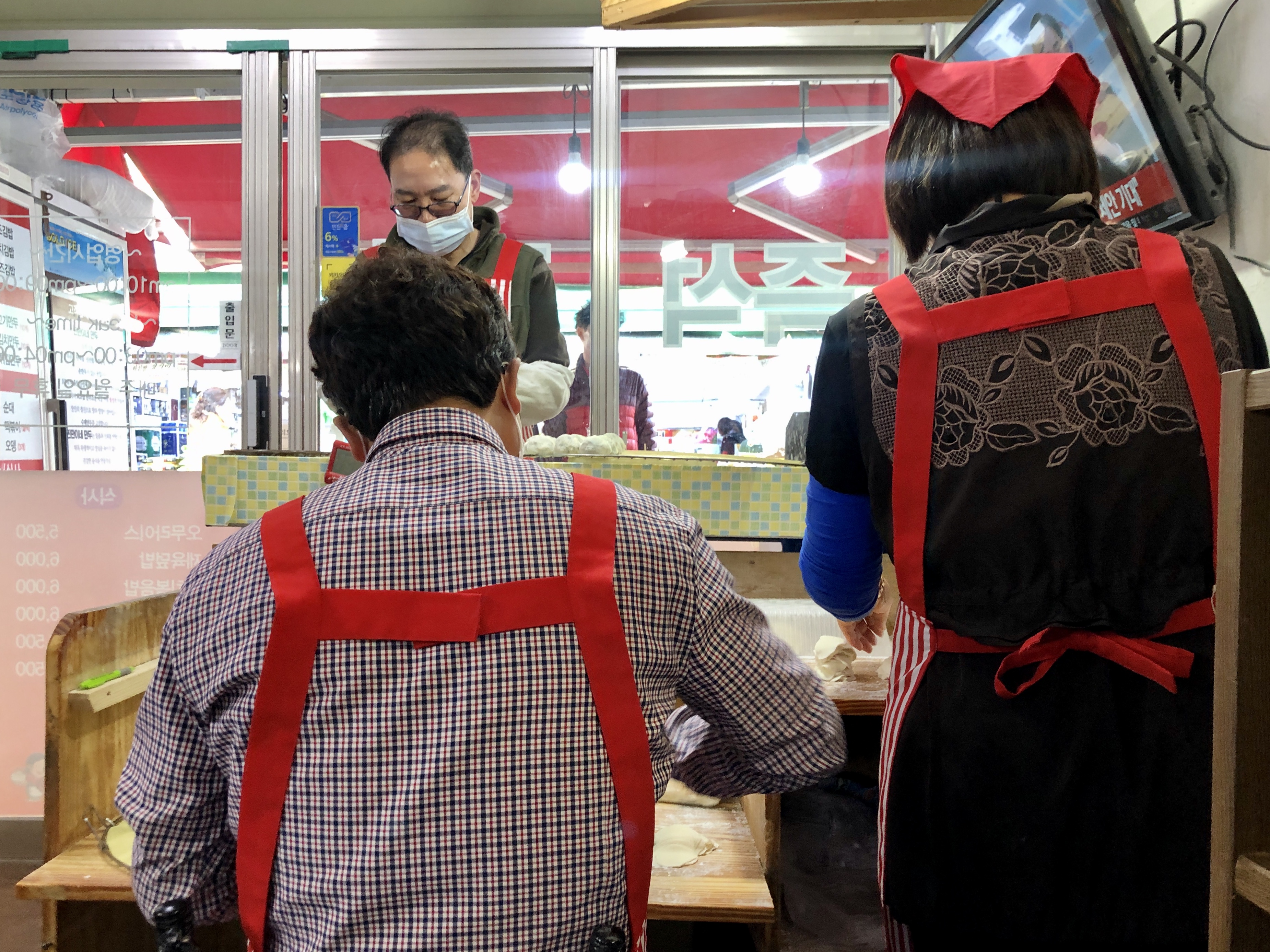 작은 내부에서는 2명씩 김치만두와 고기만두를 나누어 바쁘게 계속해서 만두를 빚고 계셨다.