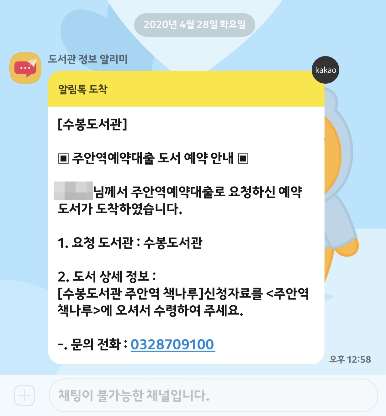 그리고 오늘 낮 카카오톡으로 오후 12:58분 도서관 정보 알리미에서 알림톡이 도착했다.