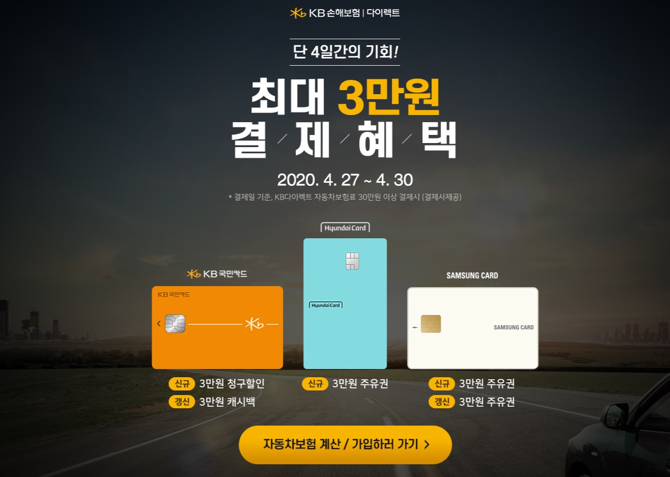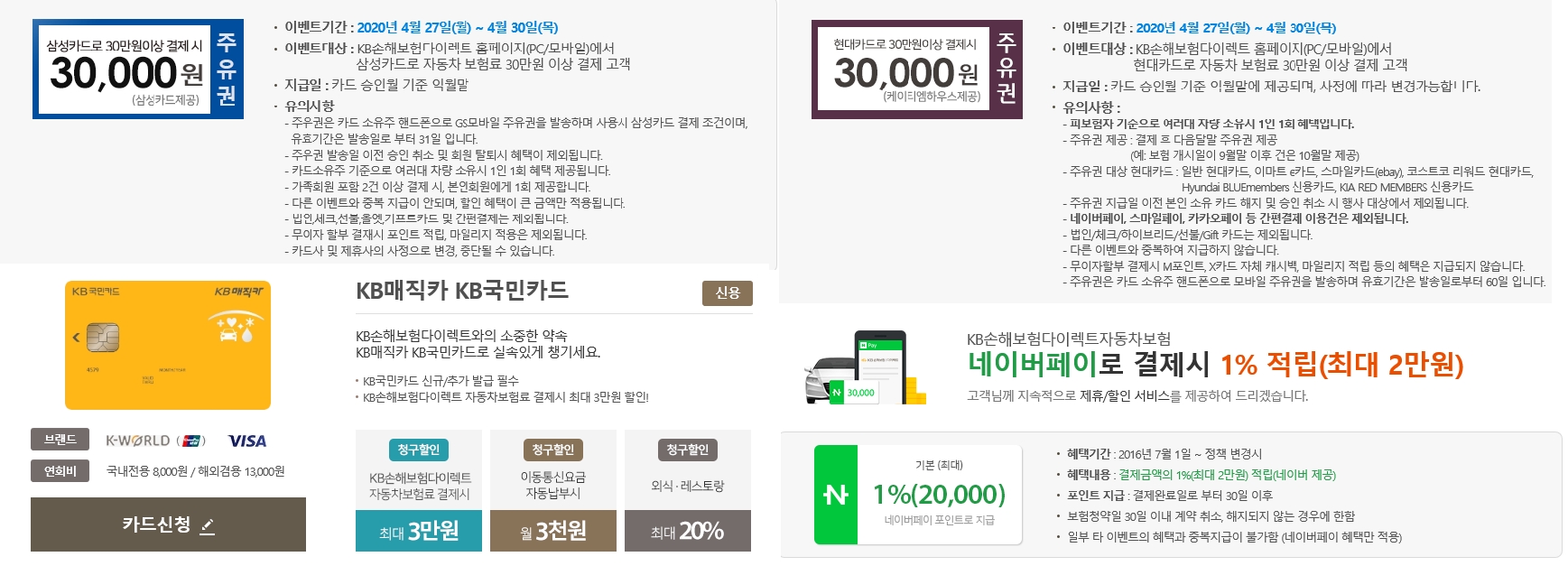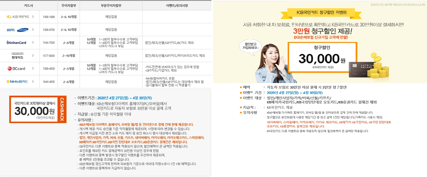 KB국민카드로 보험료 결제 시 신규회원 30,000원 청구할인 , 갱신회원 3만원 캐시백 행사를 하고 있다.