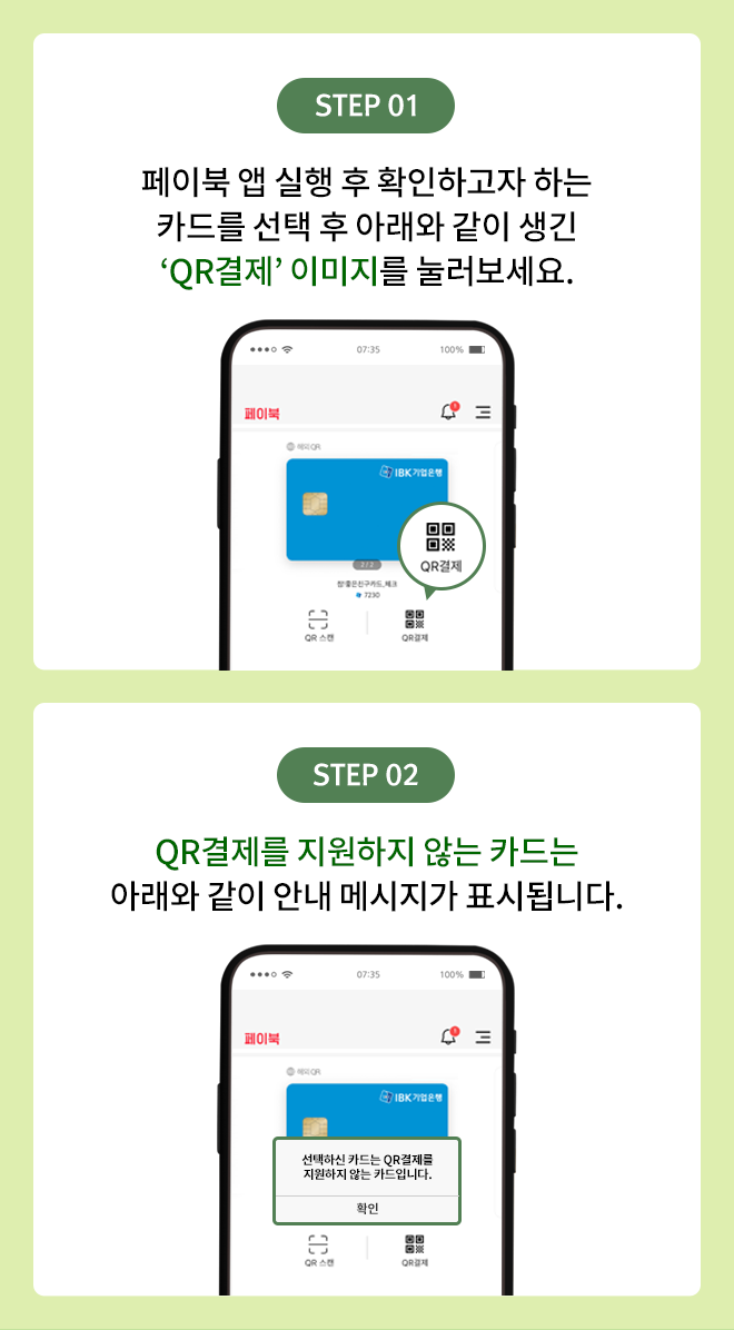 1) 페이북 앱 실행 후 확인하고자 하는 카드를 선택 후 'QR결제' 이미지 클릭