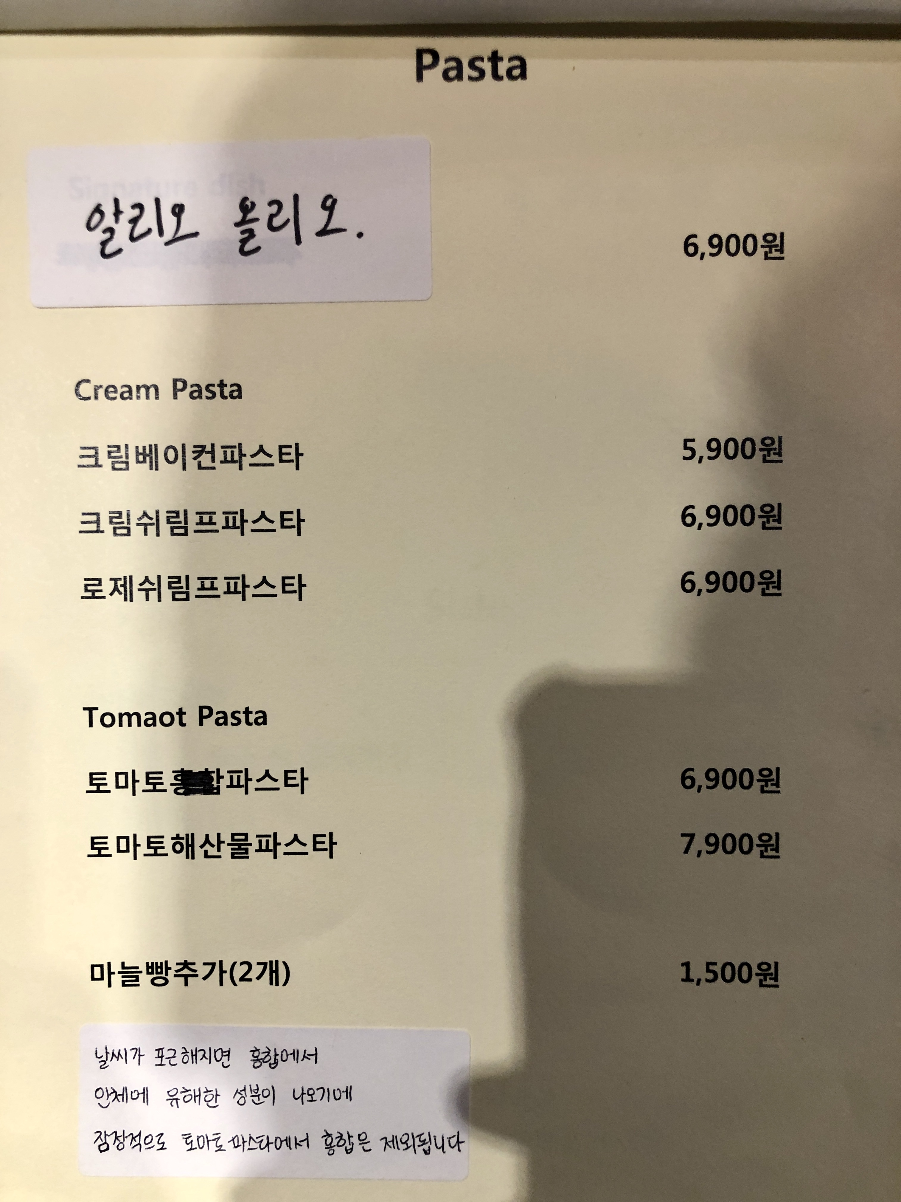 2페이지의 파스타도 크림베이컨 파스타는 5,900원으로 6천원이 되지 않는 가격으로 파스타를 즐길수 있다.
