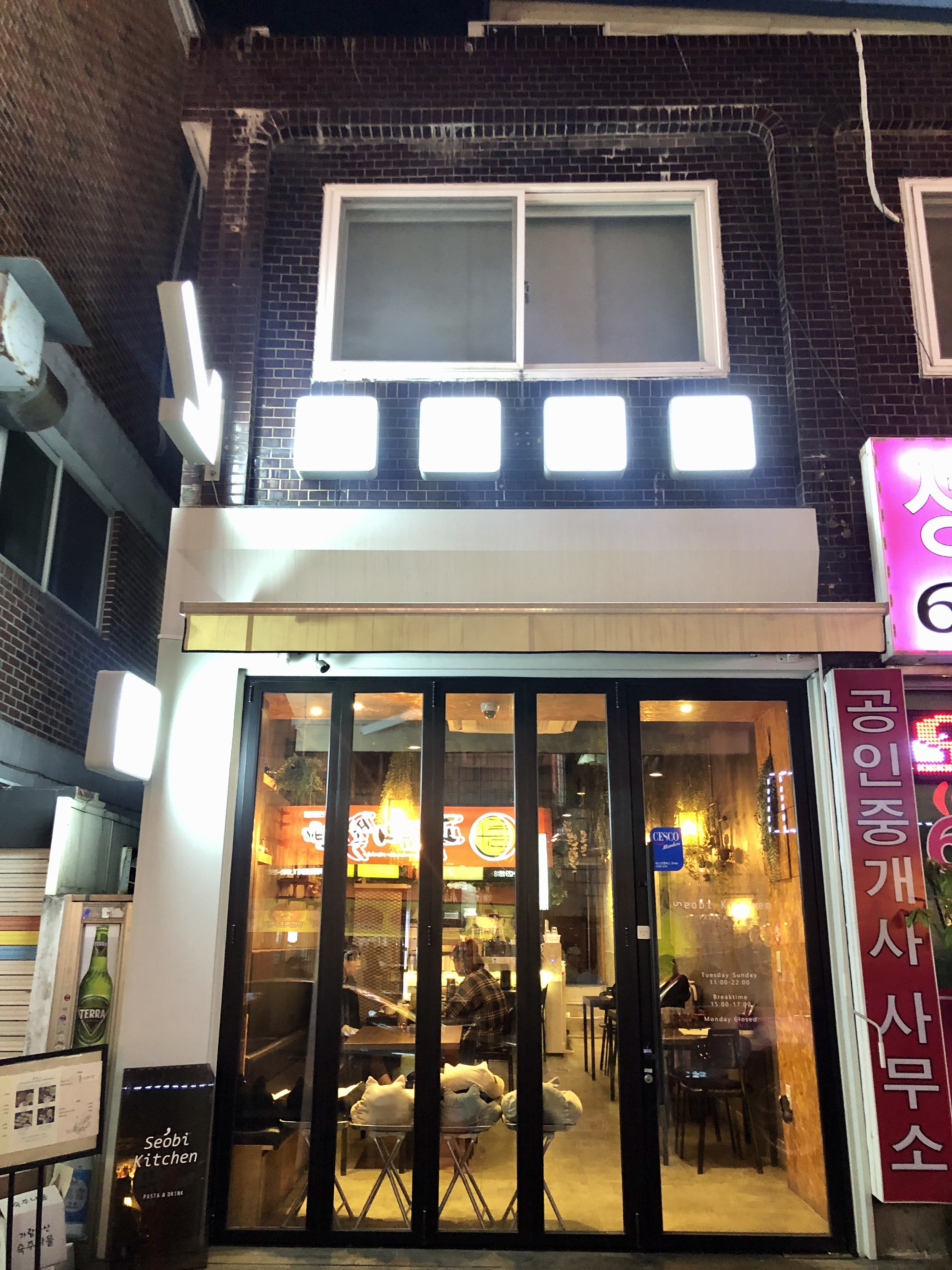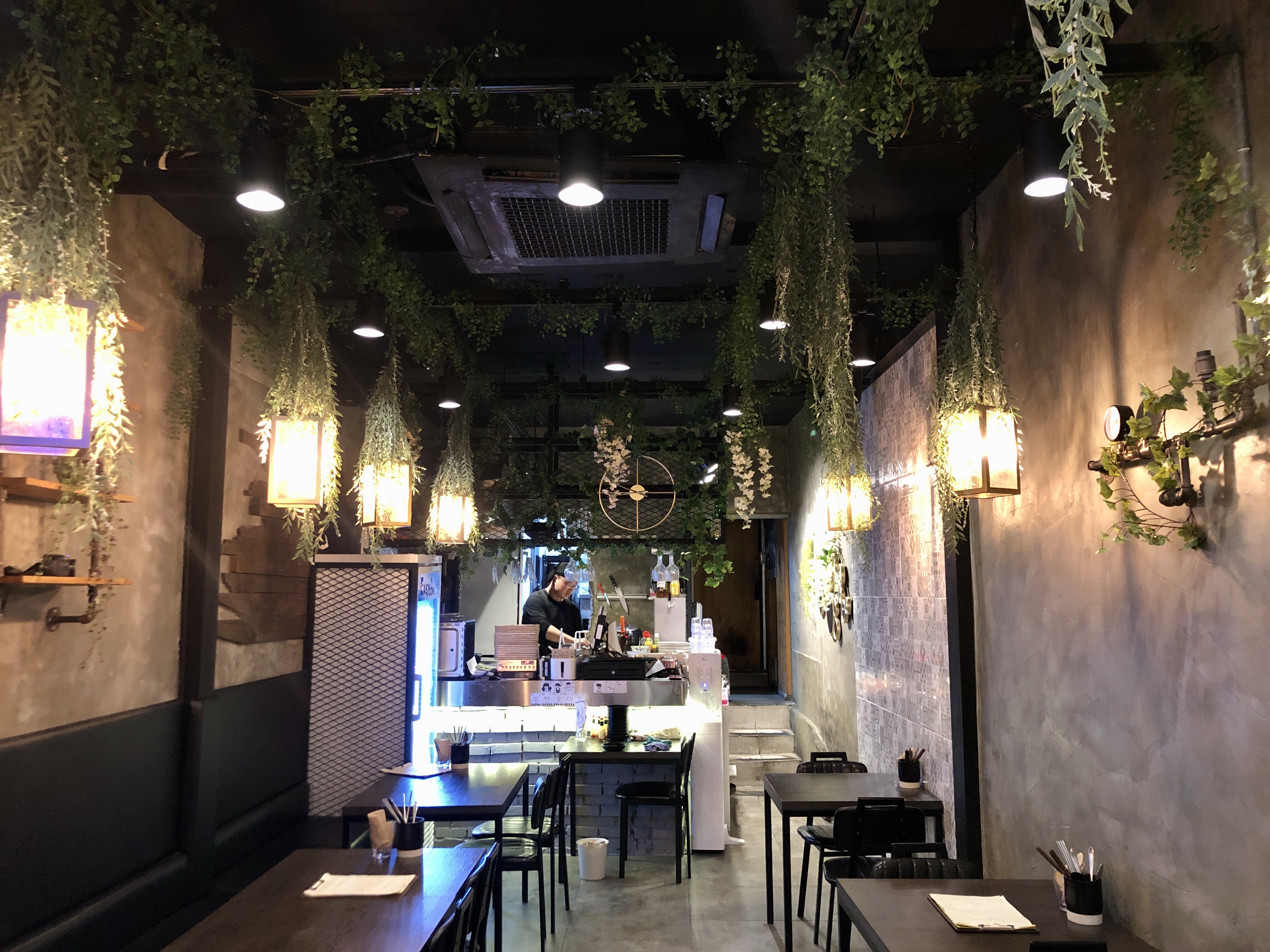 서비키친에 들어서면 콘크리트와 푸른 식물이 조화스러운 실내 입구가 첫번째로 눈의 띄고