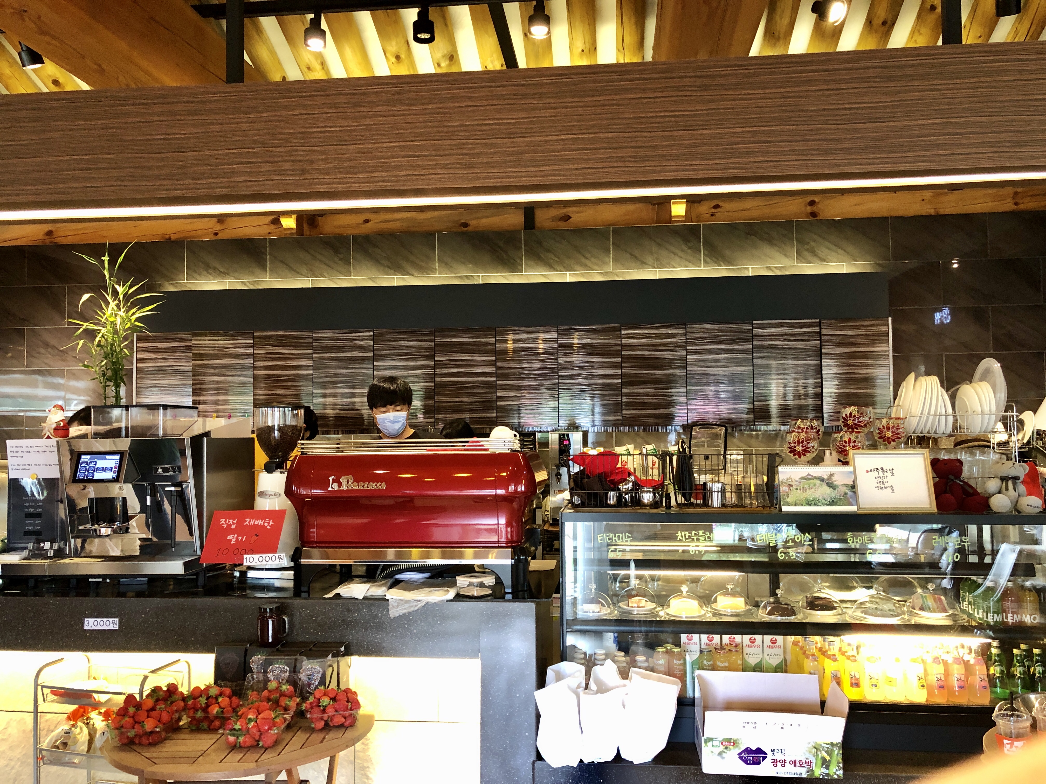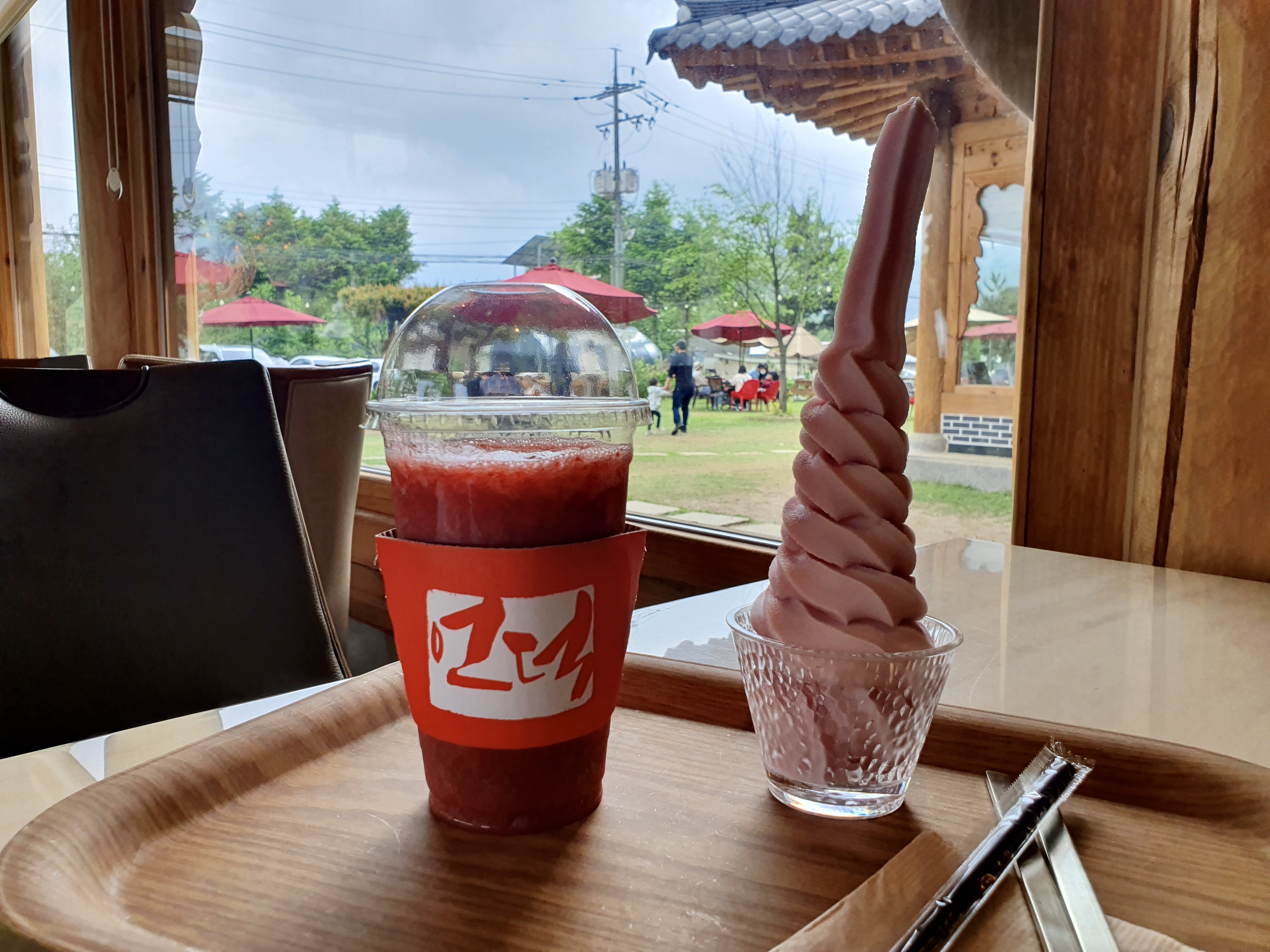 앞에 보이는 딸기가 신선하고 맛있어보여서 딸기쥬스와 딸기 아이스크림을 주문하게 되었어요!