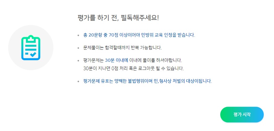 평가 20문항 중 70점 이상이어야 민방위 교육 인정을 받을 수 있습니다.