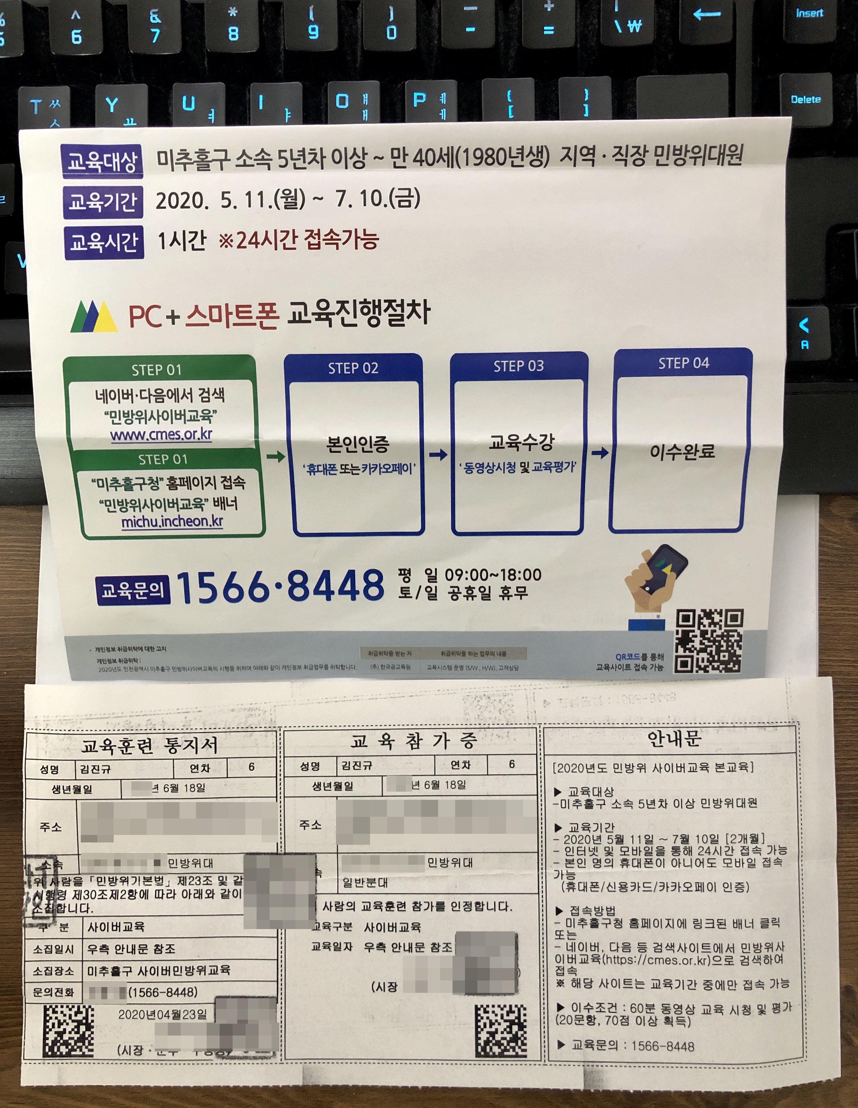 코로나로 집에서 얌전하게 지내던 중, 올해도 어김없이 민방위 교육훈련 통지서가 날아왔어요.