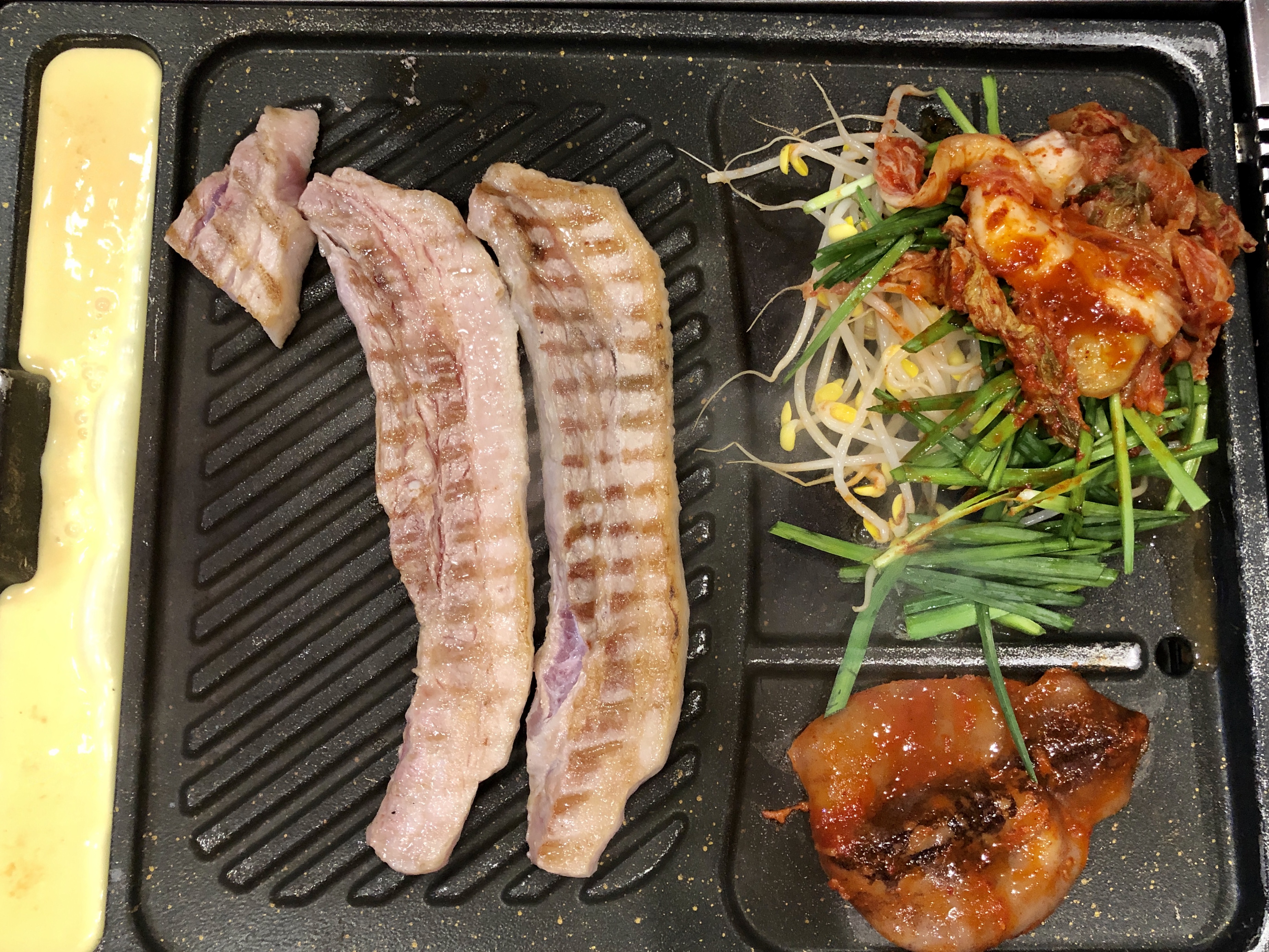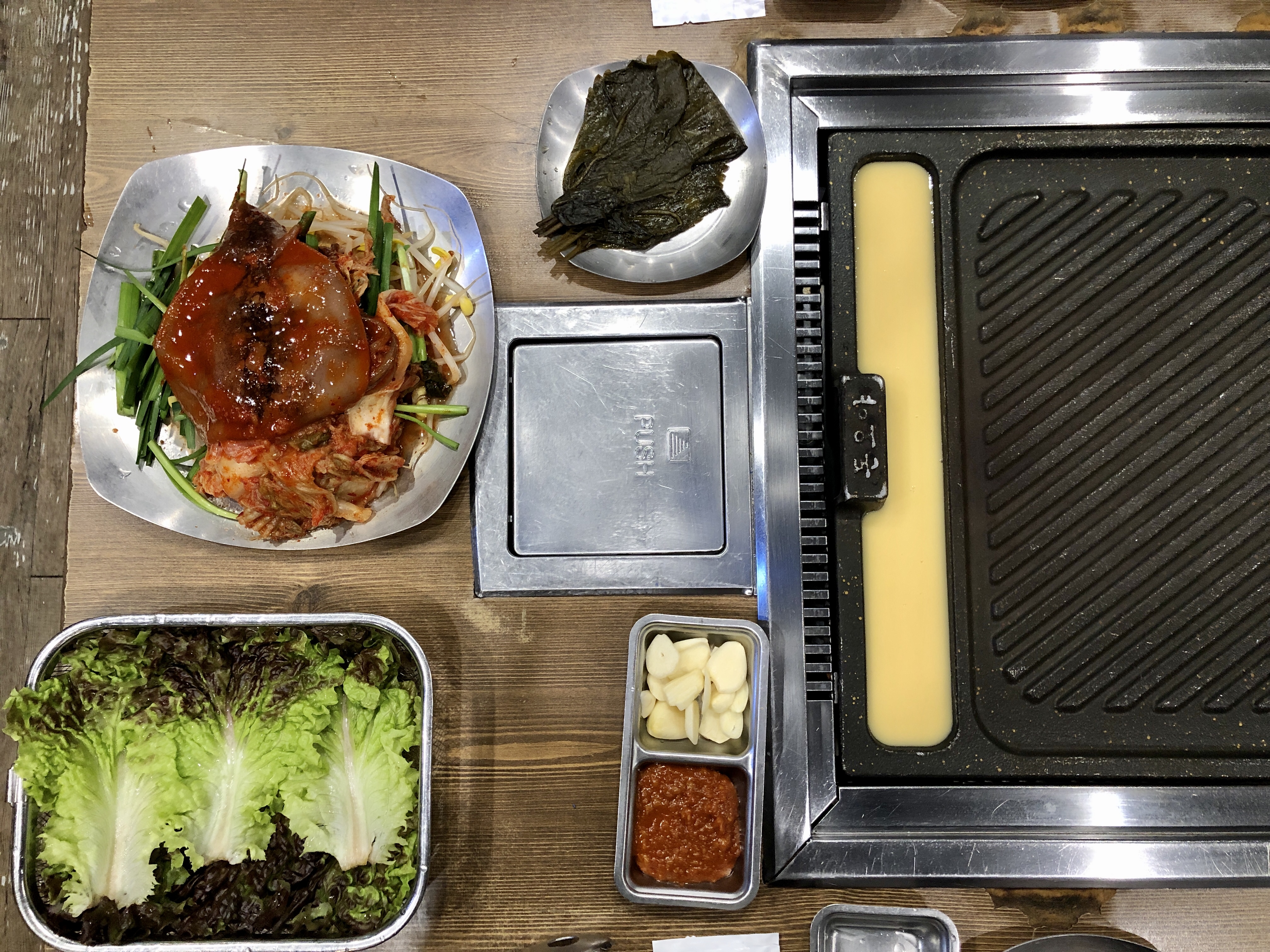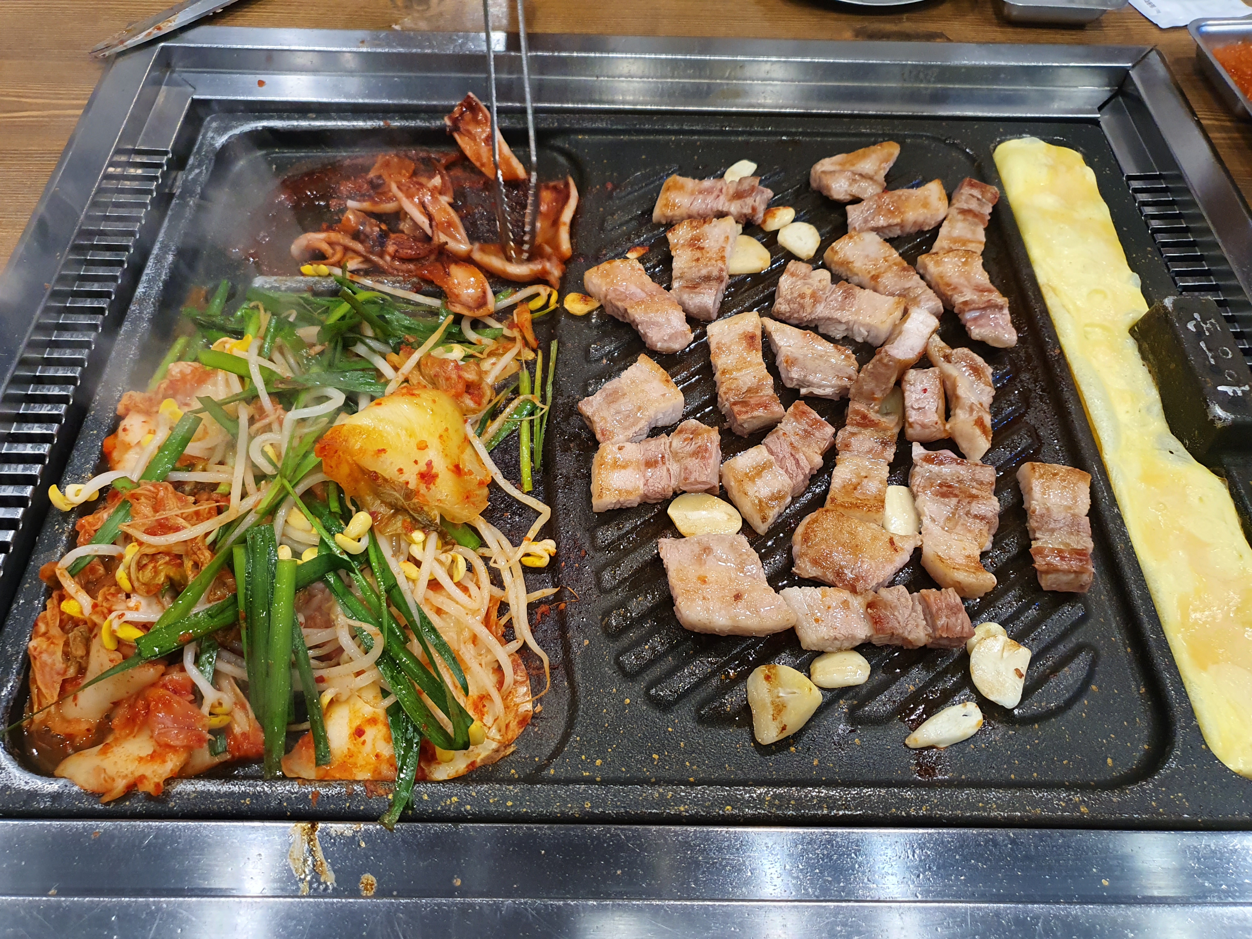불판이 고기와 채소 그리고 양념 오징어를 굽는 지역이 단차를 두고 나뉘어져 있어서