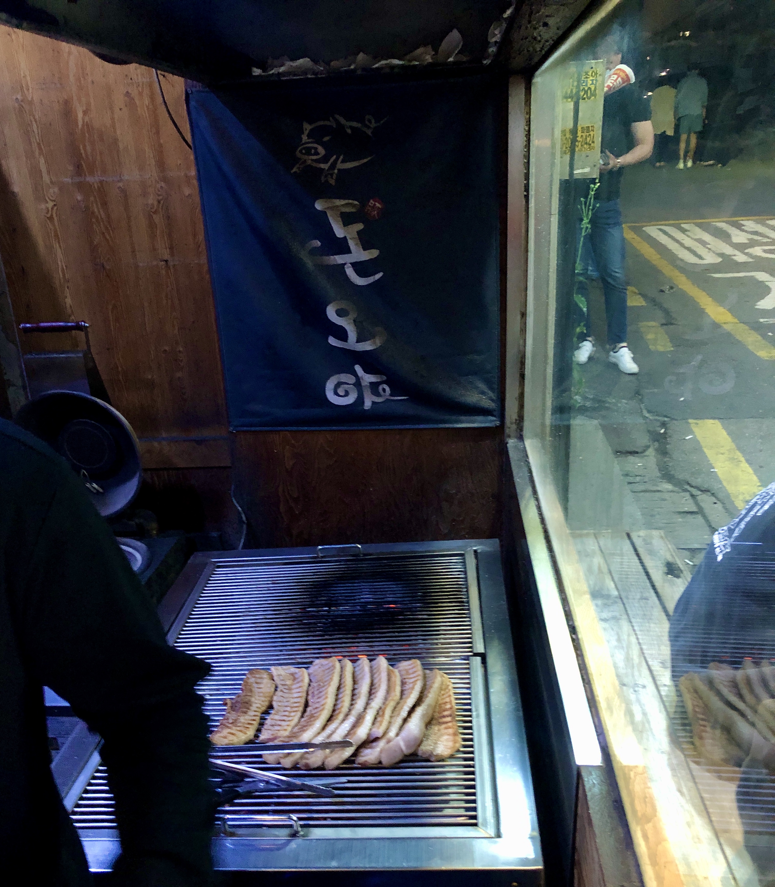 초벌숙성 삼겹살이라는 메뉴명처럼 가게 입구에서 고기가 초벌되어 등장합니다.