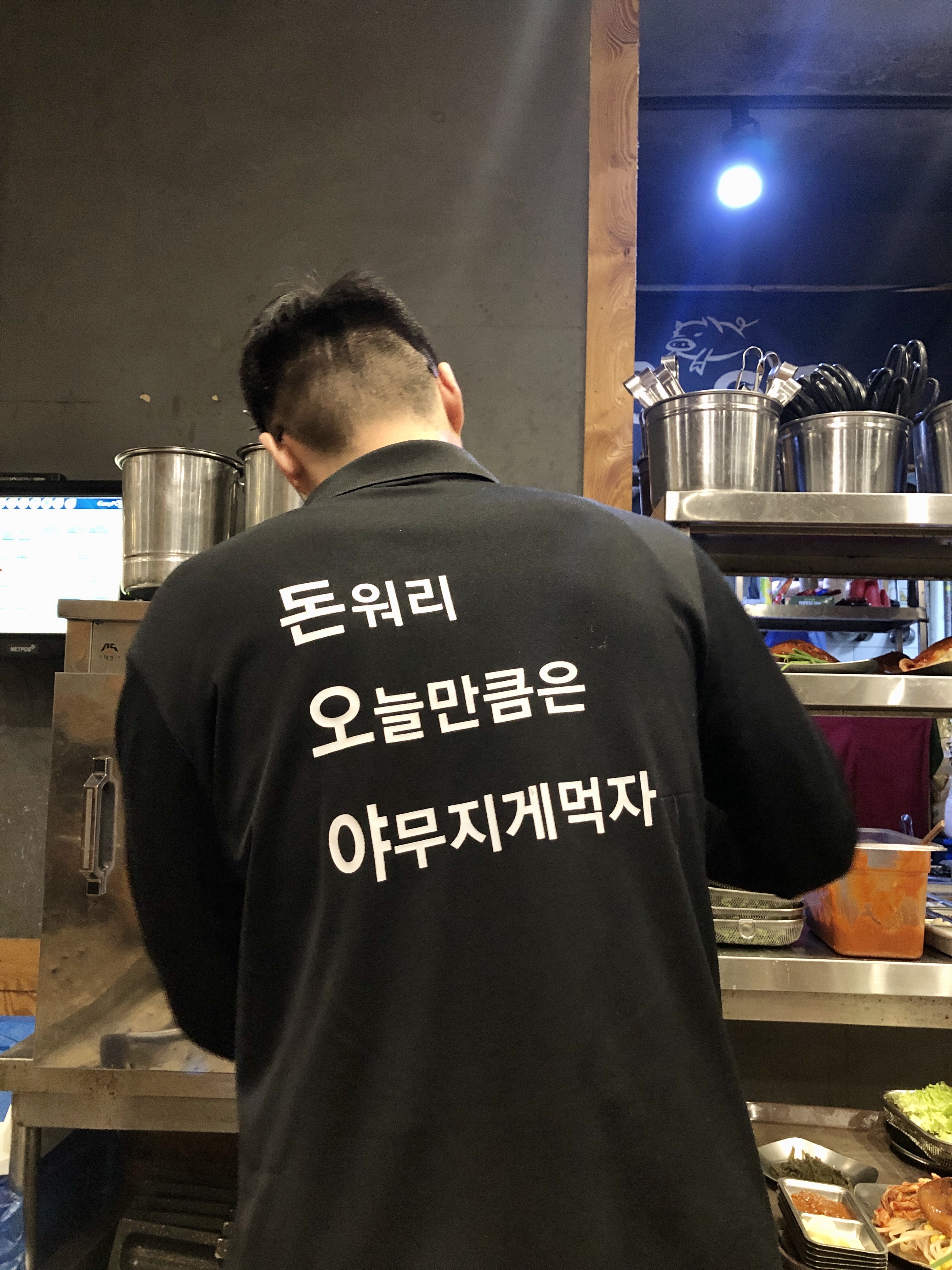 까치산 맛집 돈오야라는 가게 이름으로 삼행시를 지어서 일하는 직원들 티셔츠 뒤에 새긴것이 재미있었어요!