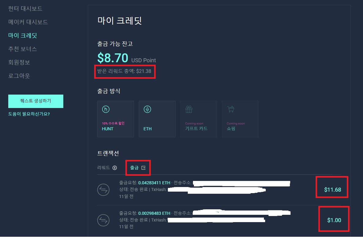 두번째로, 리워드를 현금으로 인출할 수 없고 HUNT 코인 또는 이더리움으로 받을 수 있습니다.