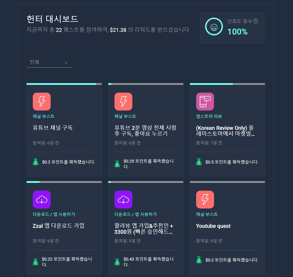 이 사이트에 그렇게 시간을 많이 쏟지 않았음에도 여태까지 총 21.38 달러를 벌었네요~!