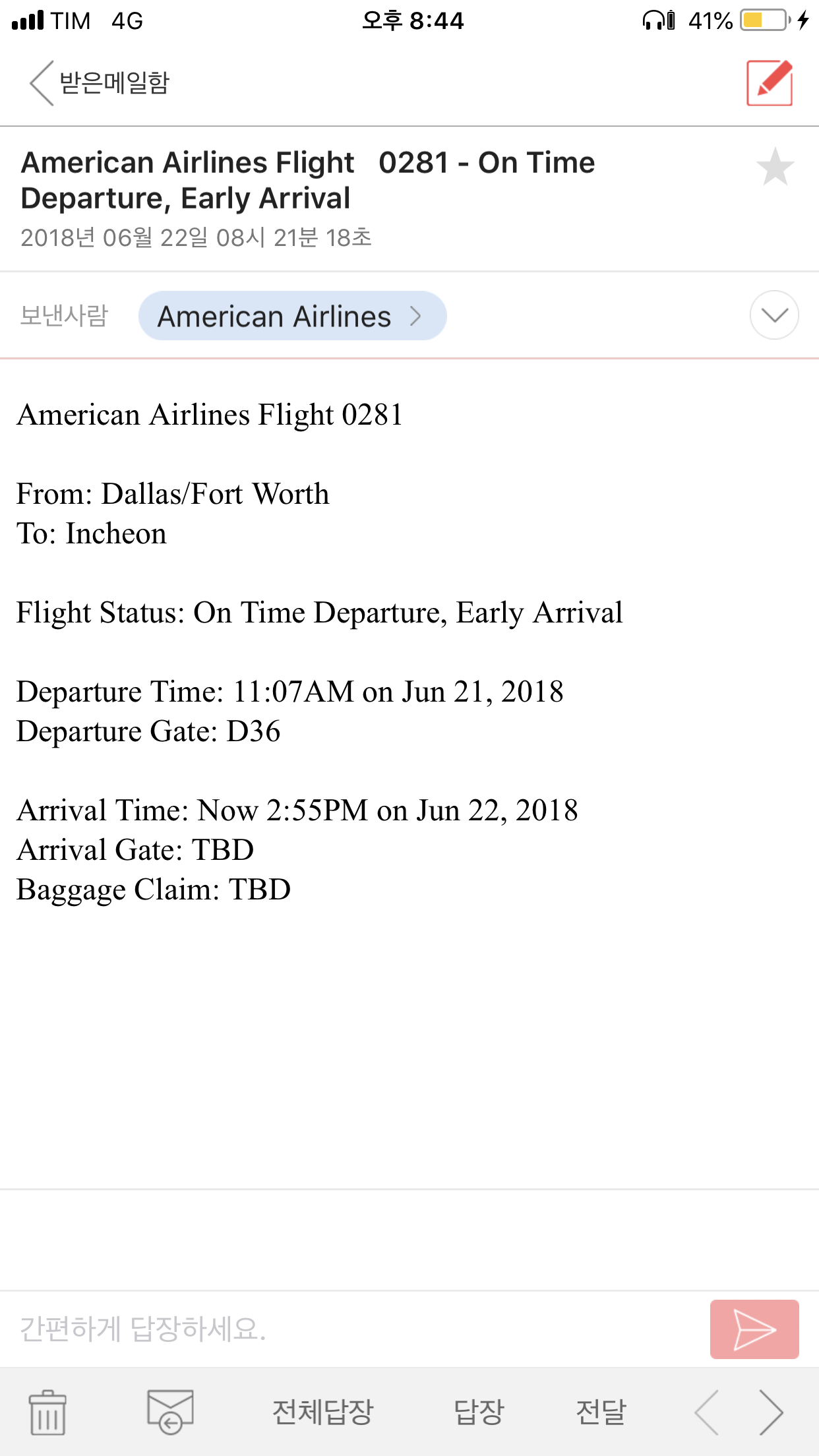 댈러스 정시출발, 인천 조기도착이라는 메일이 왔다.