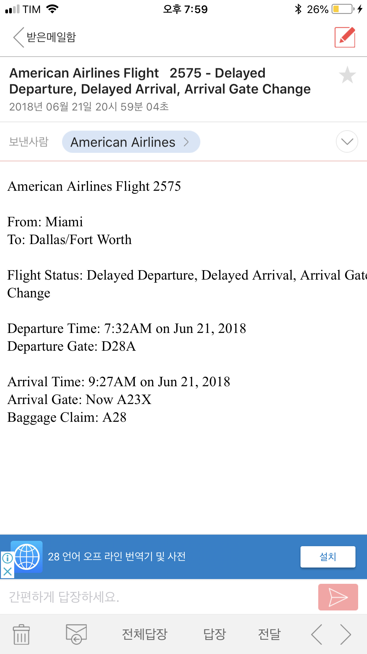 그런데, 막 체크인을 하고 나니 마이애미에서 댈러스로 가는 비행편이 지연되었다고 메일이 왔다.