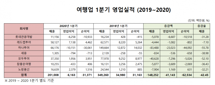 7개 여행사의 1분기 매출액은 총 2,010억원으로 전년 동기 3,493억원 대비 1,483억원(42.5%) 감소했다.