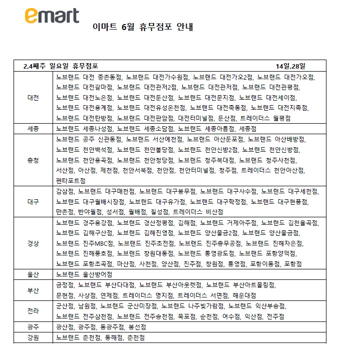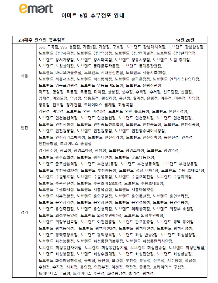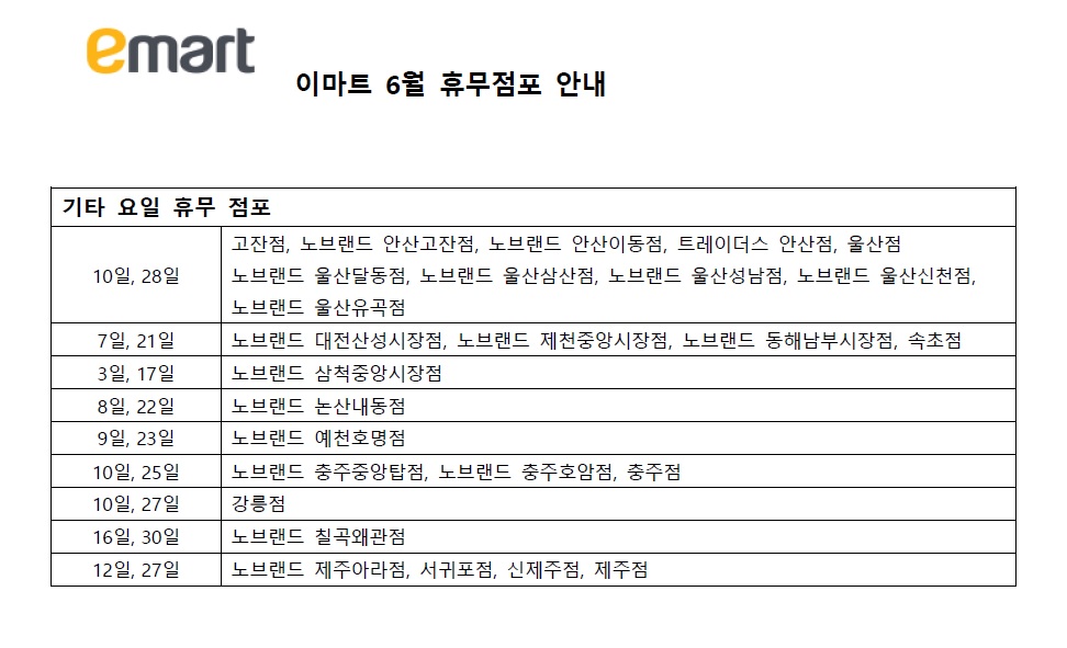 마지막으로 6월 이마트 기타요일 휴무 점포들입니다.