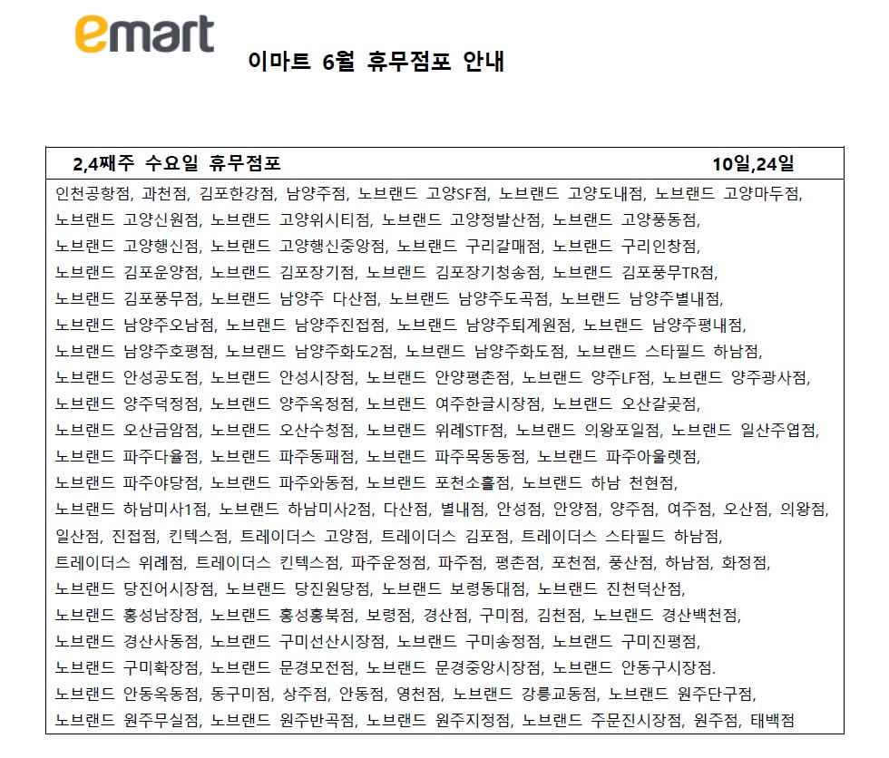 마지막으로 6월 이마트 기타요일 휴무 점포들입니다.