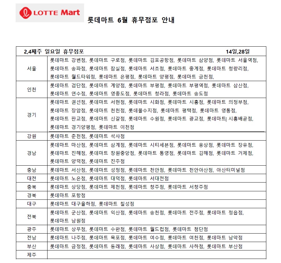 두번째로 휴무일이 많은 2,4째주 수요일인 6월10일과 24일에도 많은 롯데마트가 휴무하게 됩니다.