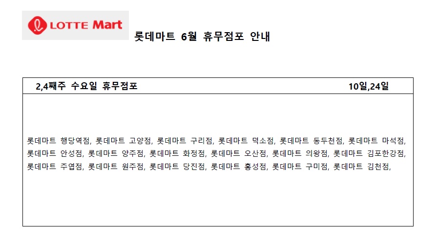 두번째로 휴무일이 많은 2,4째주 수요일인 6월10일과 24일에도 많은 롯데마트가 휴무하게 됩니다.
