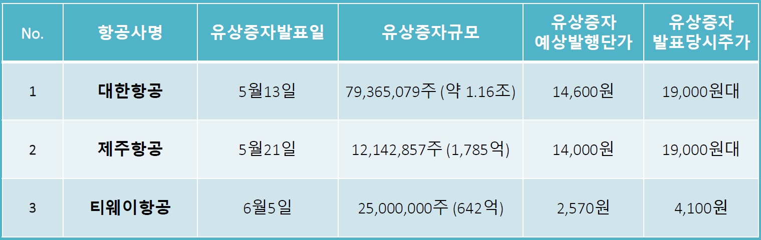 마지막으로 지난 금요일인 6월 5일 티웨이항공도 유상증자 계획을 공시했다.