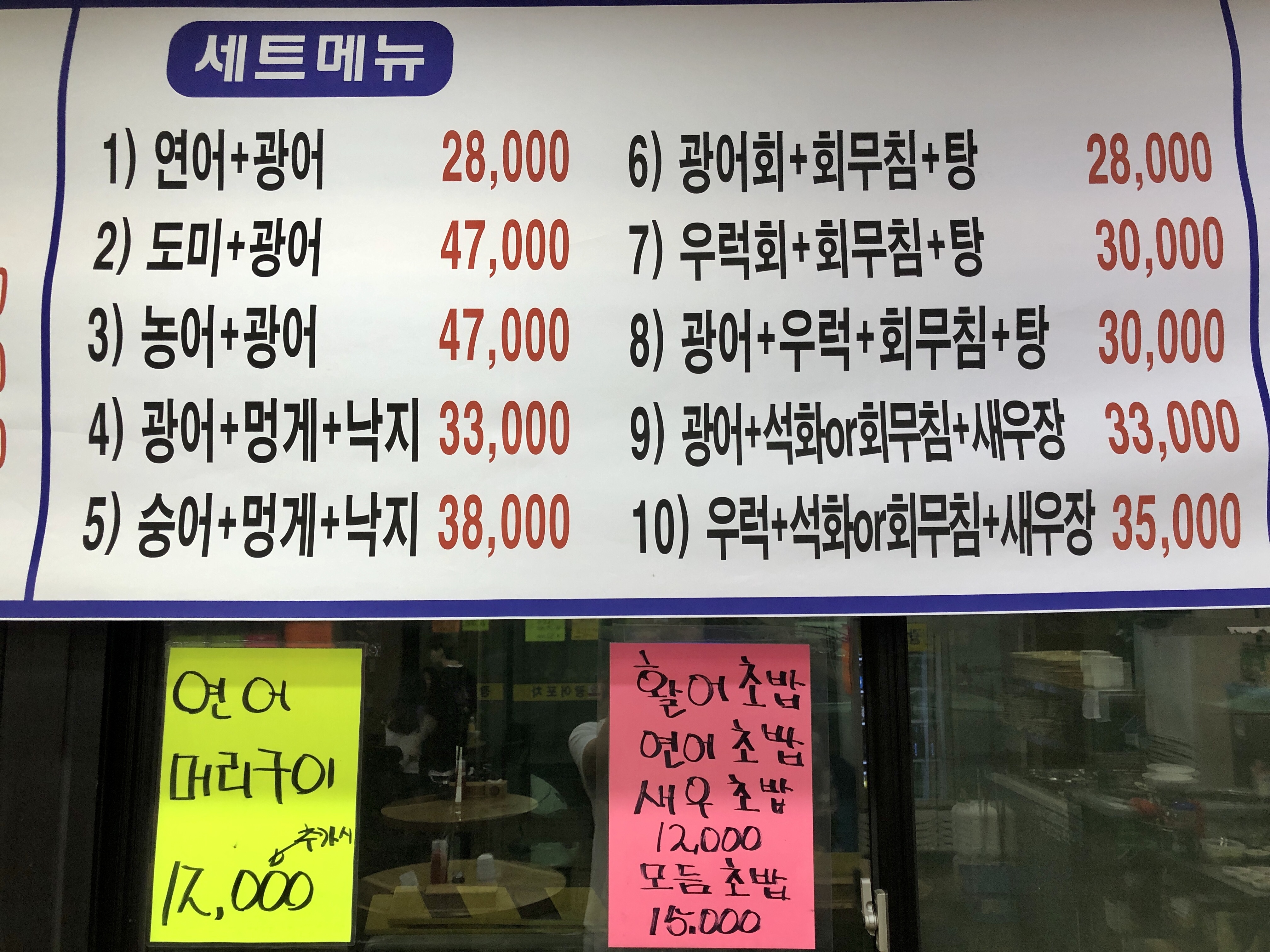 그리고 회 포장시 5,000원 추가하면 간장새우 4마리, 옥수수콘, 물회, 목이버섯샐러드를 준다고하네요