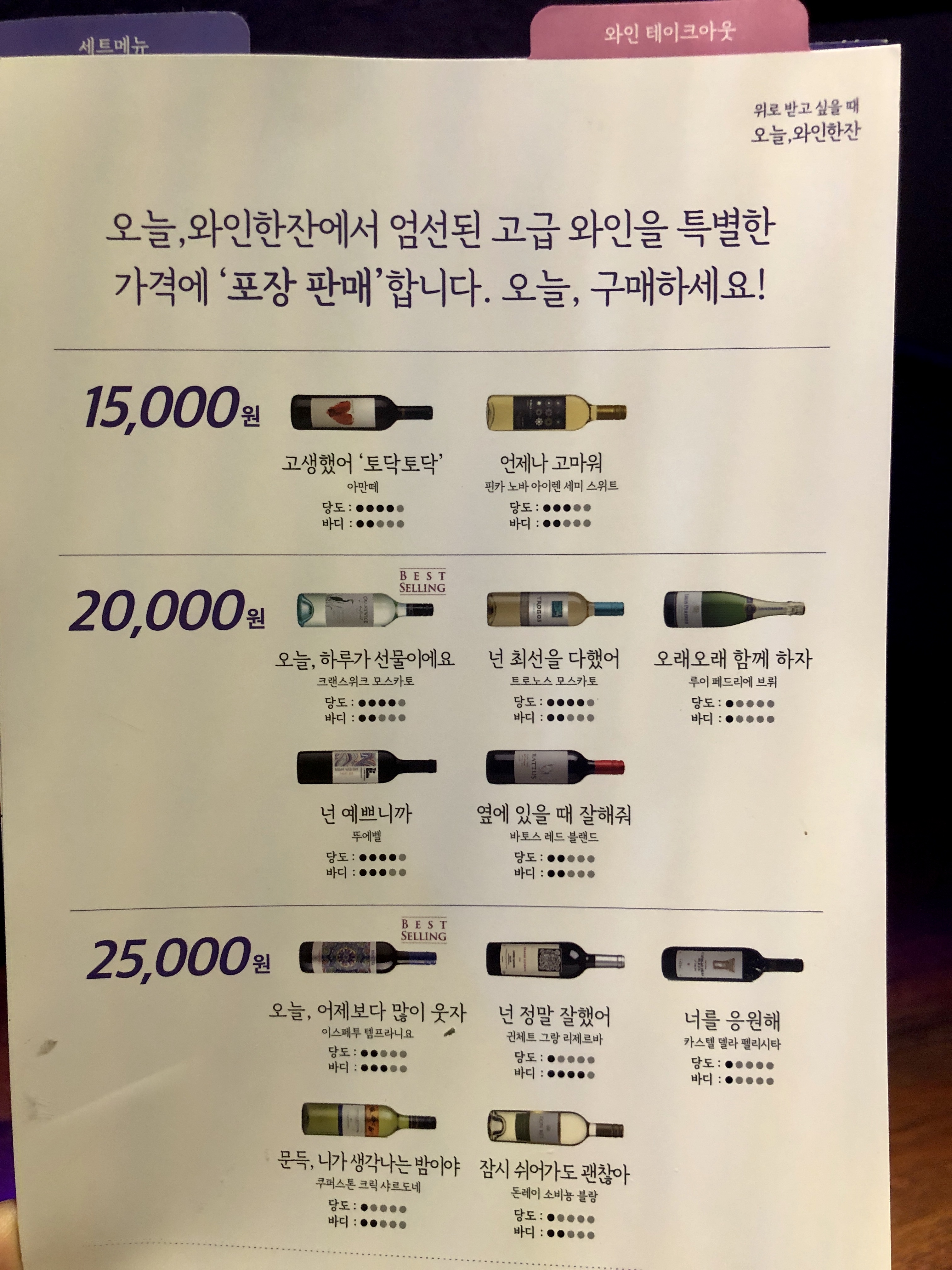 와인 메뉴판을 보는데 각각의 와인에도 역시 감성적인 문구를 넣어놓아서 눈길이 갔다.