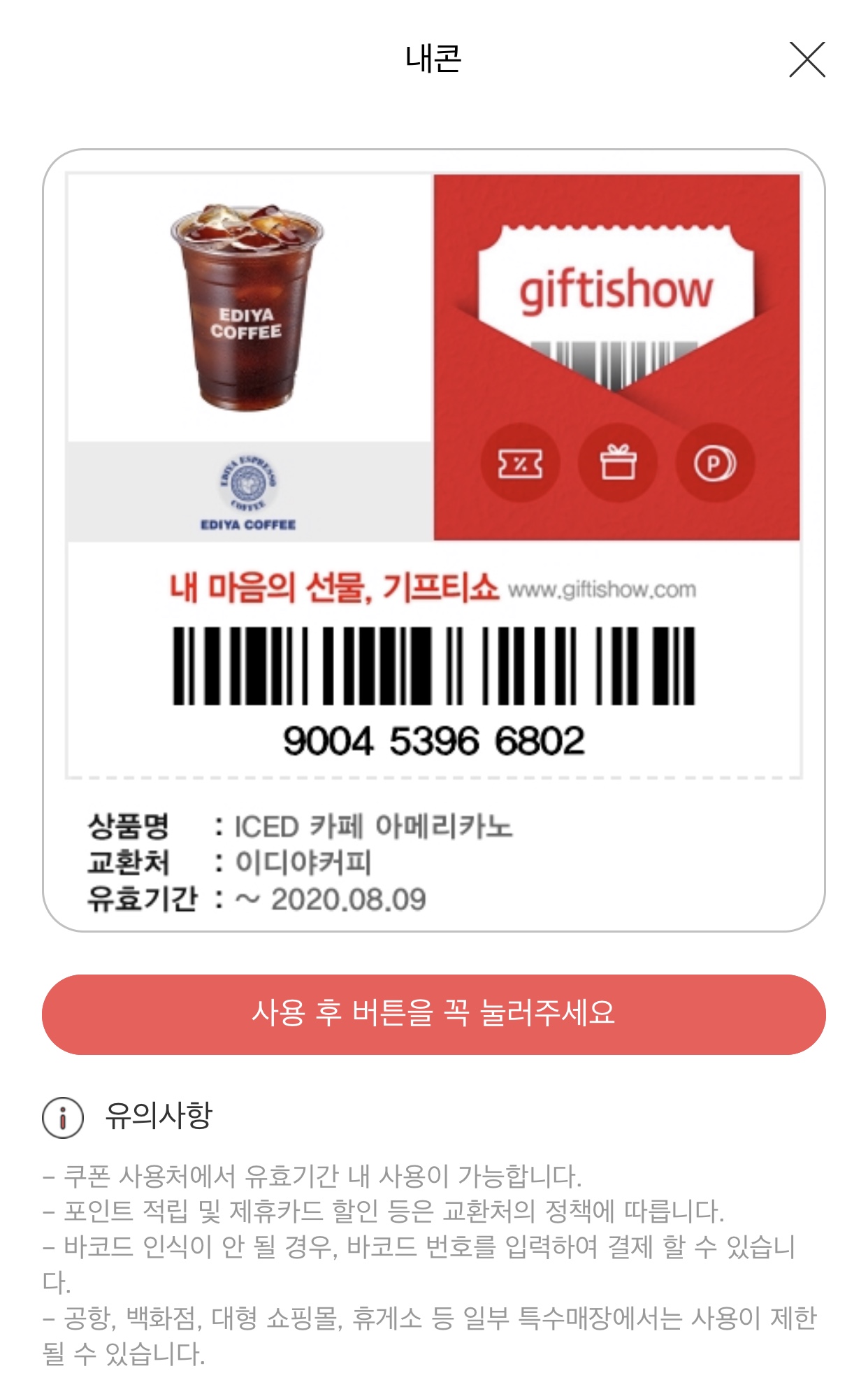 이디야 아메리카노 기준 11%할인 금액으로 바로 구매하자마자 사용할 수 있습니다.