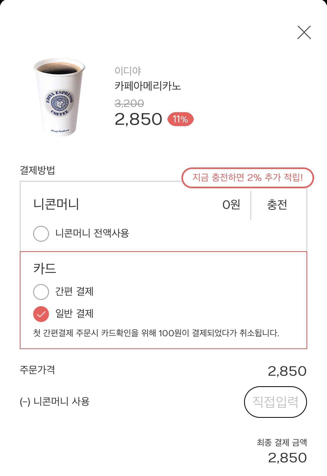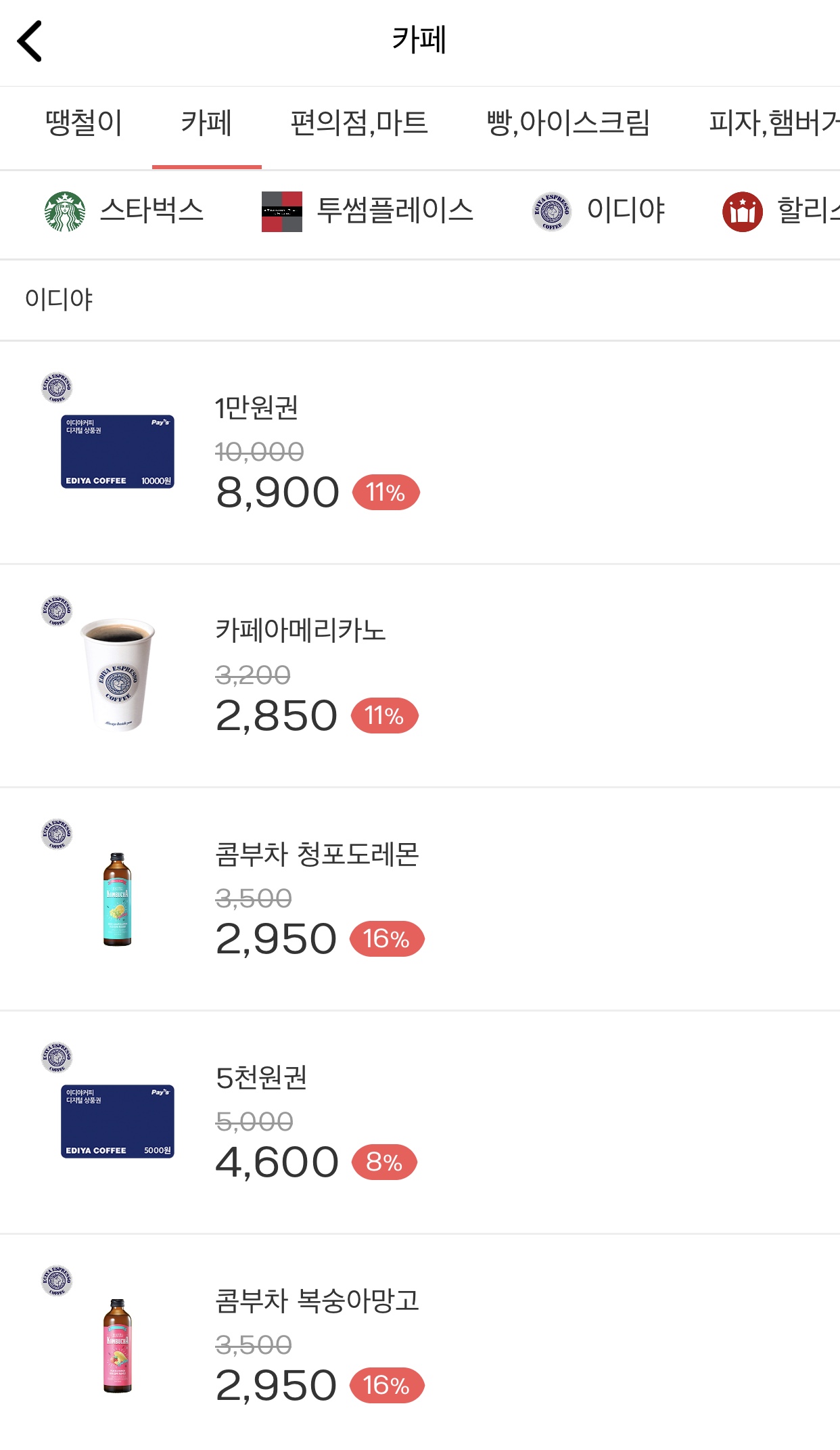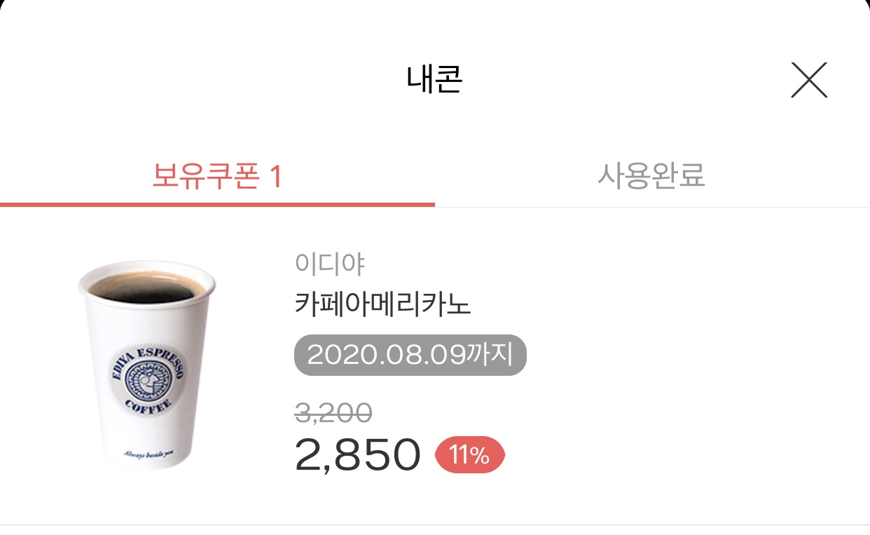이디야 아메리카노 기준 11%할인 금액으로 바로 구매하자마자 사용할 수 있습니다.