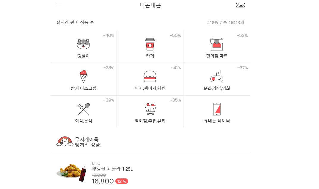 서비스 항목은 땡처리부터 카페, 편의점/마트, 빵, 아이스크림, 피자, 햄버거, 치킨 등 매우 다양합니다.