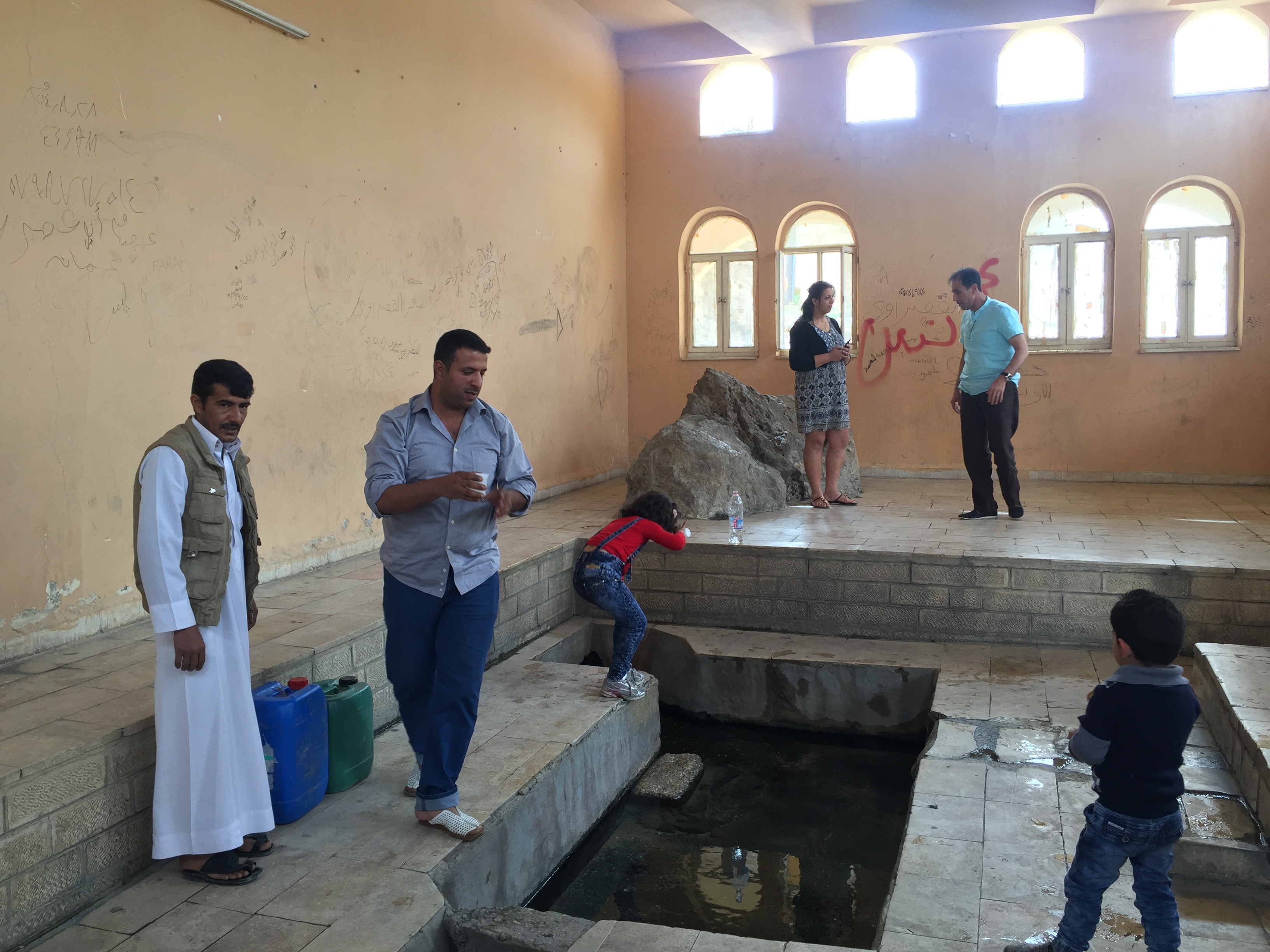 그 샘은 마을 입구에 있는데, 3개의 하얀 돔형으로 이루어진 시멘트 건물 안에 있다.