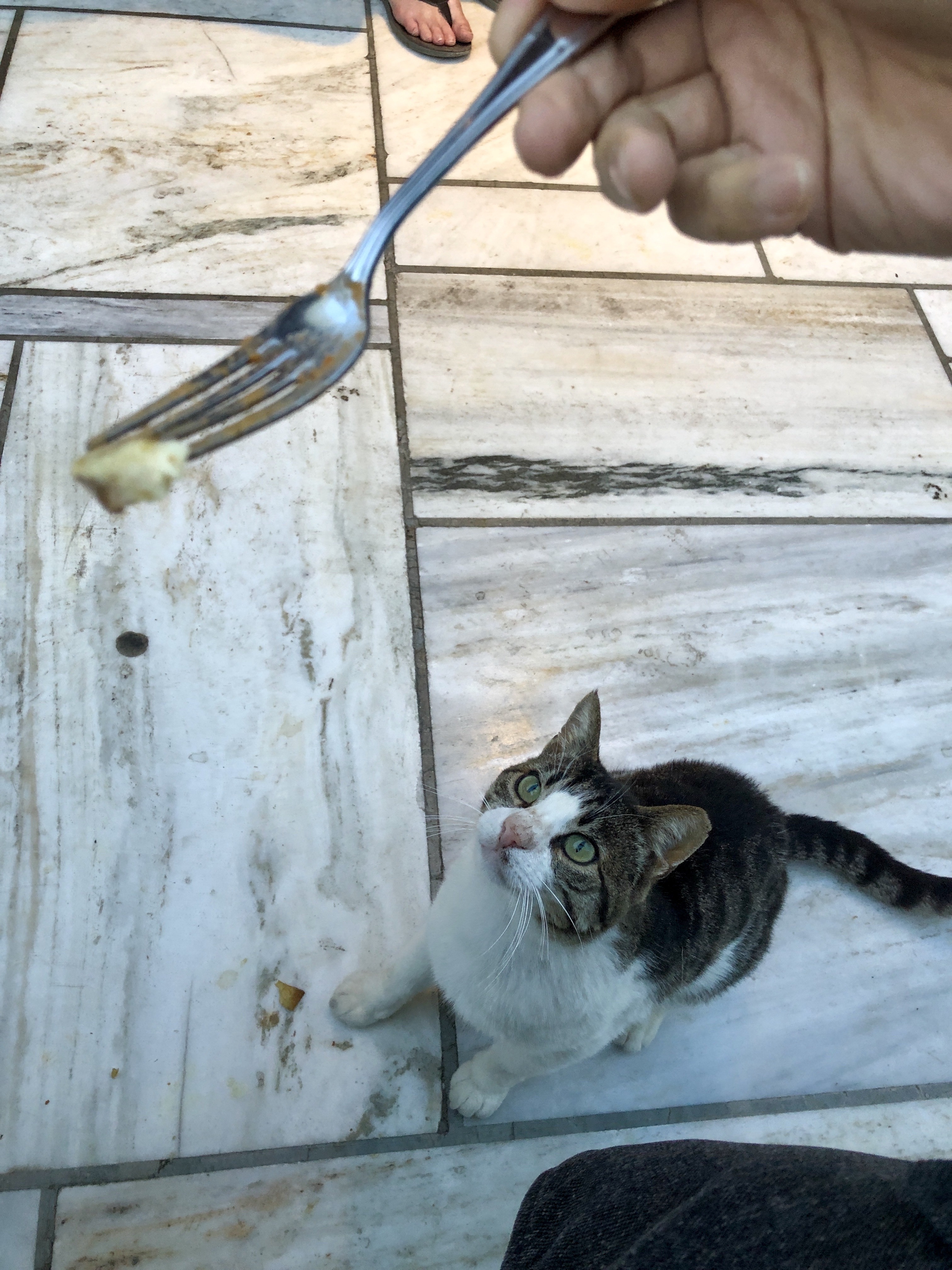 저녁을 주문하고 기다리고 있는데 여기서 사는 것으로 보이는 고양이 한 마리가 와서 아는 척을 한다