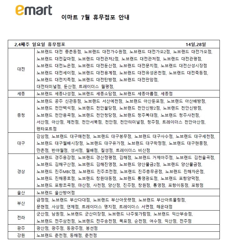 마지막으로 7월 이마트 기타요일 휴무 점포들입니다.