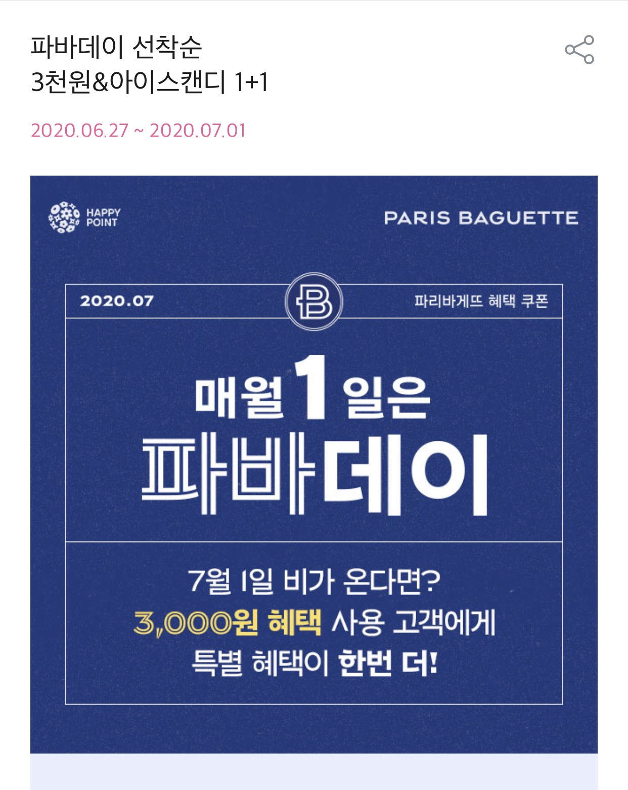 그런 파리바게트에서 매월 1일 파리바게트데이 일명 '파바데이'를 지정하여 소비자들에게