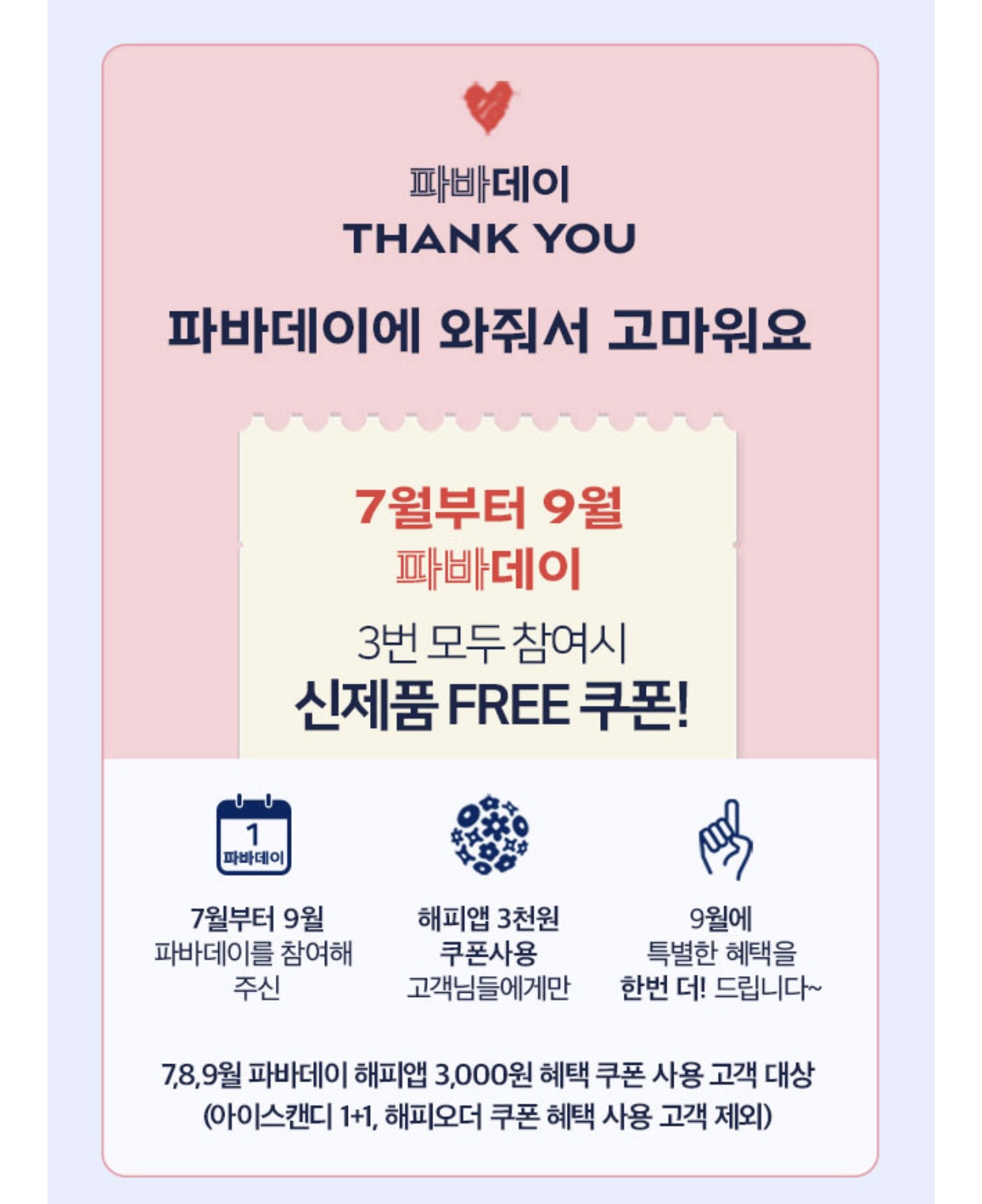 또한 7월부터 9월까지 3개월간 3번 모두 파바데이에 참여했을 경우 신제품 FREE 쿠폰을 준다고 합니다.