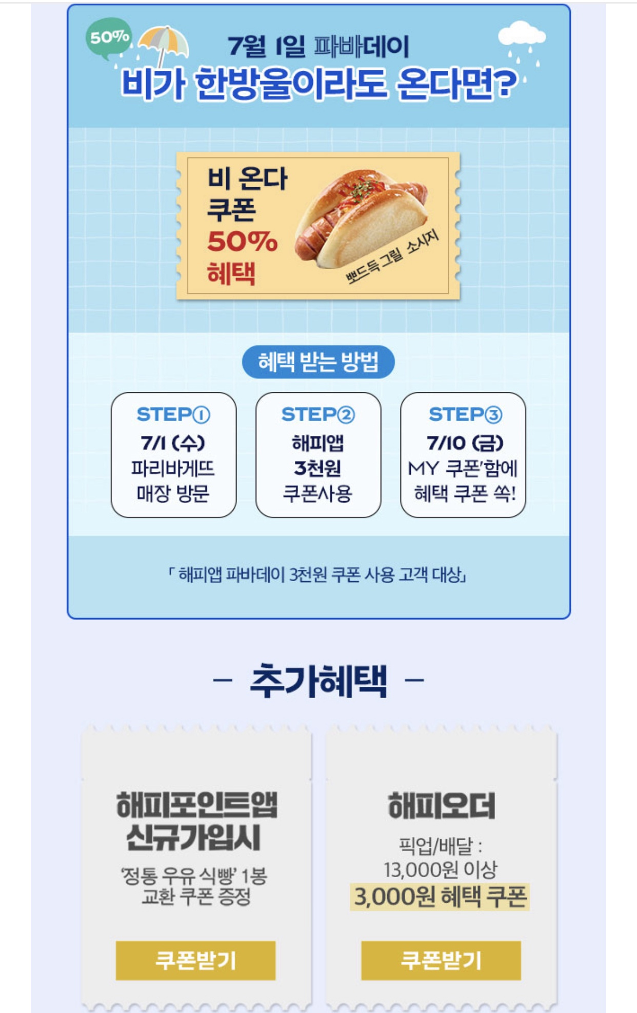 3) 7/1일에 비가 한방울이라도 온다면 뽀드득 그릴소시지 50% 할인 쿠폰 제공