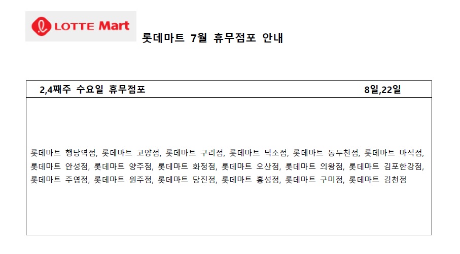 두번째로 휴무일이 많은 2,4째주 수요일인 7월8일과 22일에도 많은 롯데마트가 휴무하게 됩니다.