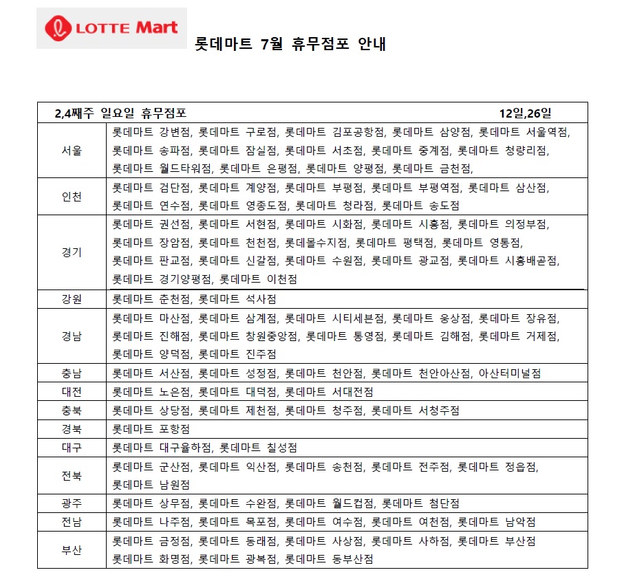 대부분의 롯데마트 점포는 2,4째주 일요일인 12일과 26일에 휴무합니다.