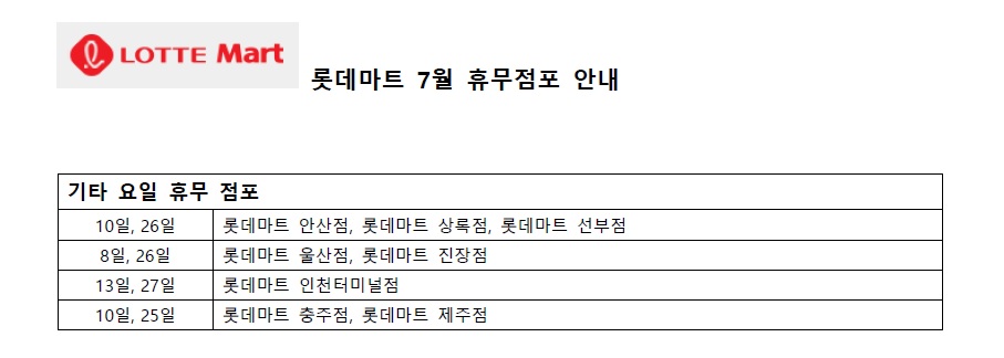 오늘은 7월 롯데마트 휴무일에 대해서 알아보았습니다.