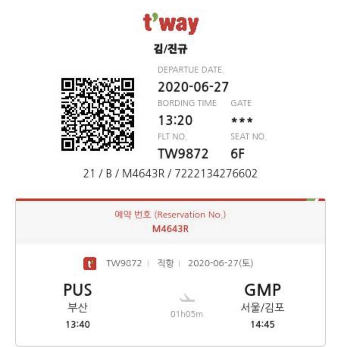 13:40분 출발 티웨이항공TW9872 편을 통해 서울로 올라가게 되어있었다.