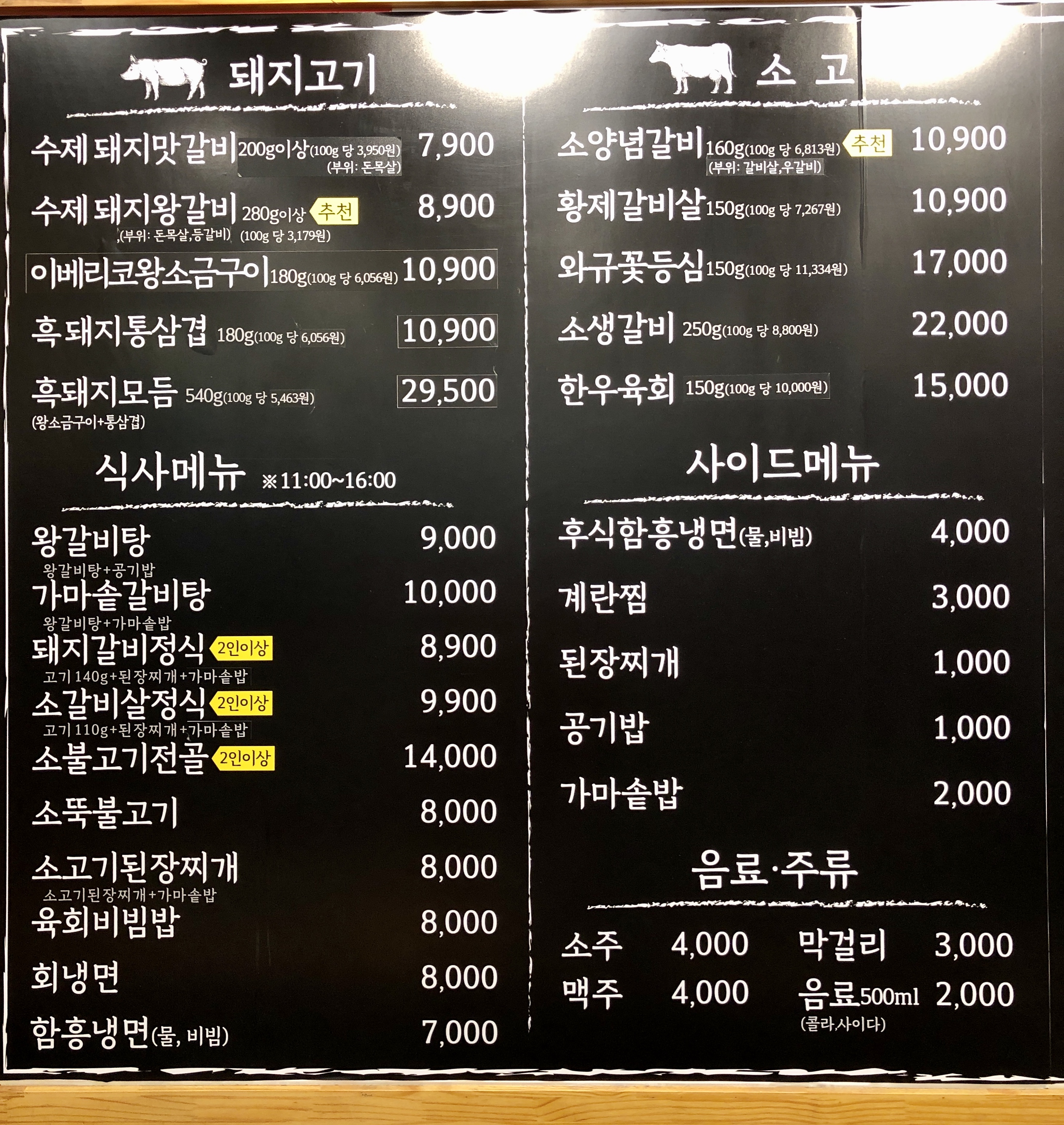 가격과 고기 메뉴별 그림으로 알기 쉽게 표기되어 있어서 주문하는데 큰 도움이 되었습니다.