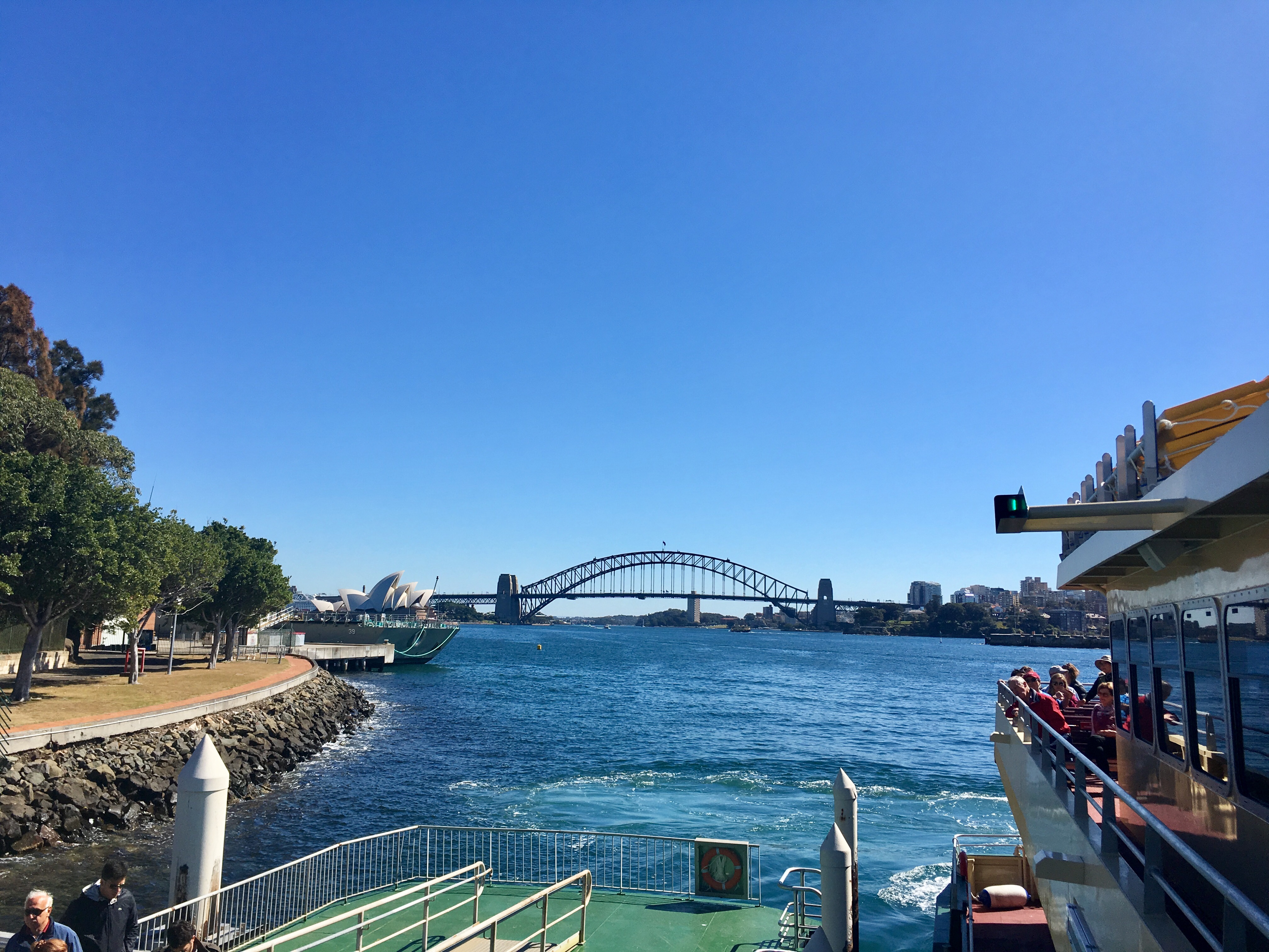 시드니 서큘러키에서 배를 타고 하버브릿지와 오페라하우스를 선상에서 보며