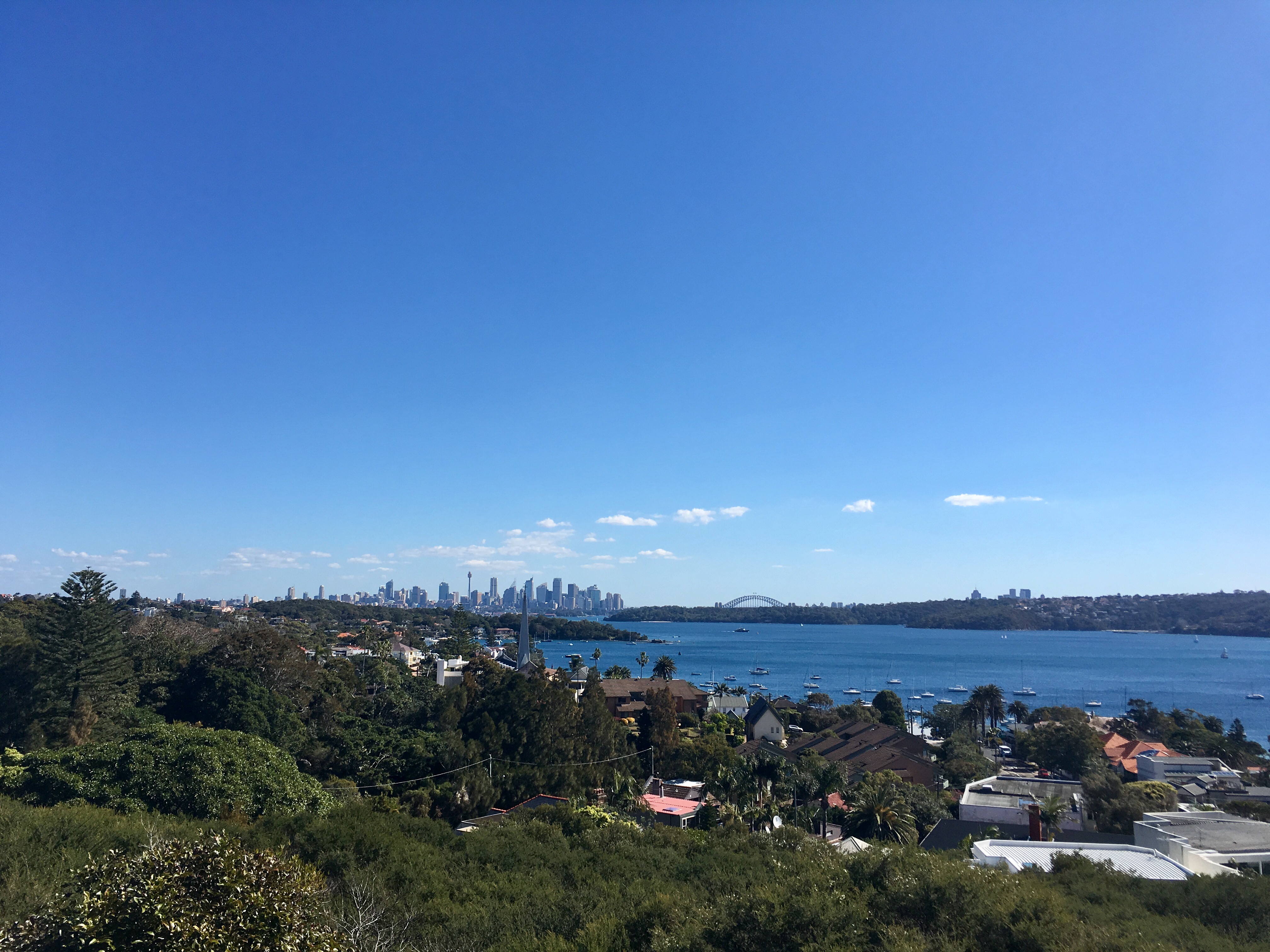 더들리 페이지에서 바라보는 시드니 시티는 푸른빛의 바다와 하늘, 멀리 보이는 하버 브리지, 오페라 하우스,